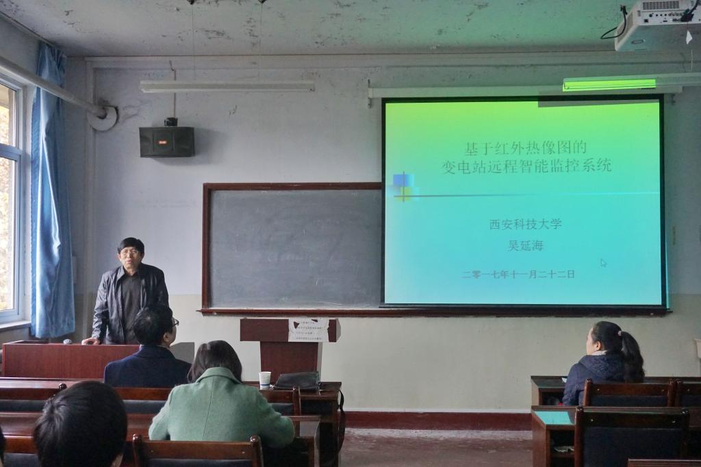 11月21日,西安科技大学吴延海教授在金花校区机电楼511多媒体教室做了题为“基于红外热像图的变电站远程智能监控系统”的学术报告会。电子信息学院师生代表共计100余人参加了本次报告会,报告会由电子信息学院研究生秘书行露主持。