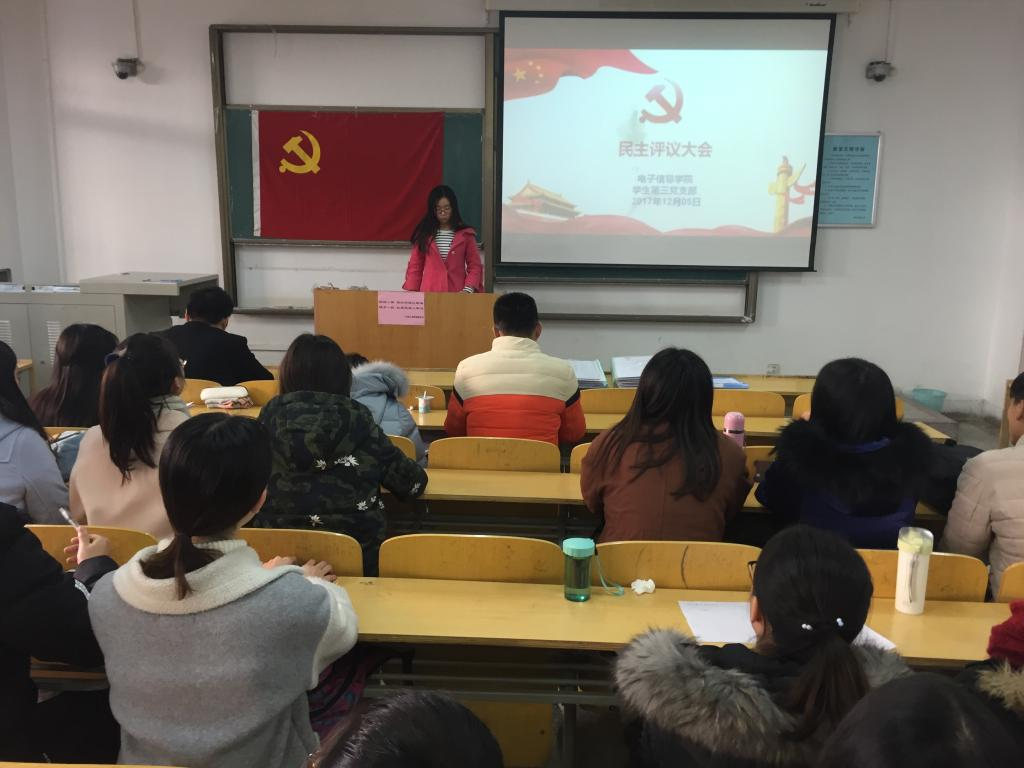 为深入学习贯彻落实党的十九大精神,扎实推进“两学一做”学习教育常态化制度化,保持党的先进性和纯洁性,切实发挥党员的先锋模范作用和党支部的战斗堡垒作用。根据校党委组织部下发的《关于开展2017年民主评议党员工作的通知》要求,电子信息学院所属的17个支部于12月5日至9日顺利完成党员民主评议。学院党政领导干部均以普通党员的身份参加了支部的民主评议。