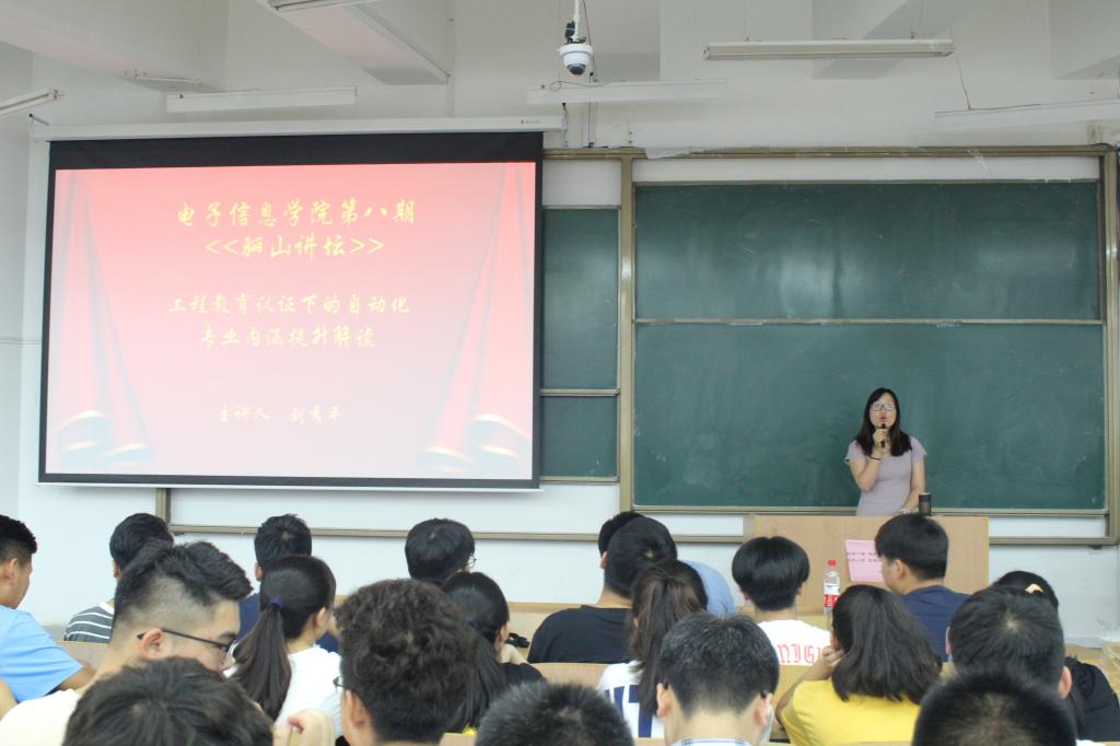 为提高同学们对自动化专业的认识和理解,提升专业内涵,6月11日晚,电子信息学院邀请刘秀平老师在教学楼B-233室做主题为“工程认证教育下的自动化专业内涵提升解读”的讲座。电信学院团总支书记刘妍萍、控制系教师陈良和自动化专业全体同学参加了此次的讲座。讲座由刘妍萍老师主持。