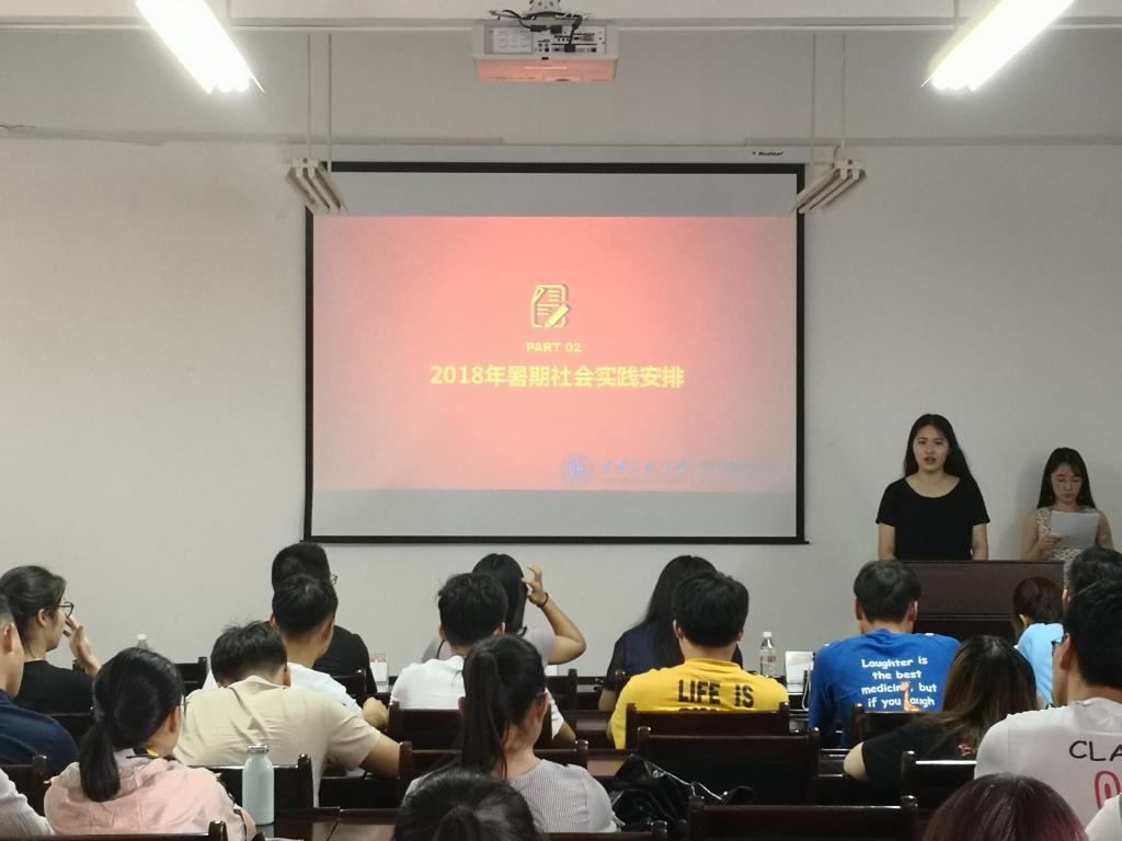 活动开始,全体成员观看2017年电信学院暑期社会实践活动的记录视频,视频以实地参观、走访调研、公益活动三个板块向大家展示了2017年我院三支校级实践队伍的风采与成果,对17级的同学能够起到一个良好的表率引导作用。随后,团总支副书记严雪宁对2018年暑期社会实践活动的相关安排进行介绍,她从宣传动员、立项筹备、组织实施、后期总结共四个核心阶段,对大家一一进行详细讲解,明确实践任务目标。最后,刘妍萍老师做动员讲话,希望各班团支部干部在组织班级同学参加暑期社会实践活动时,能牢记大学生的责任和使命、紧扣活动主题,做到人人都参与,班班有立项。最重要的是,在具有安全保障的基础上积极完成社会实践,为自己负责,交上一份满意的答卷。