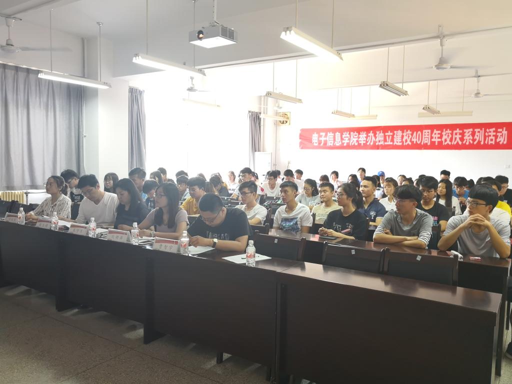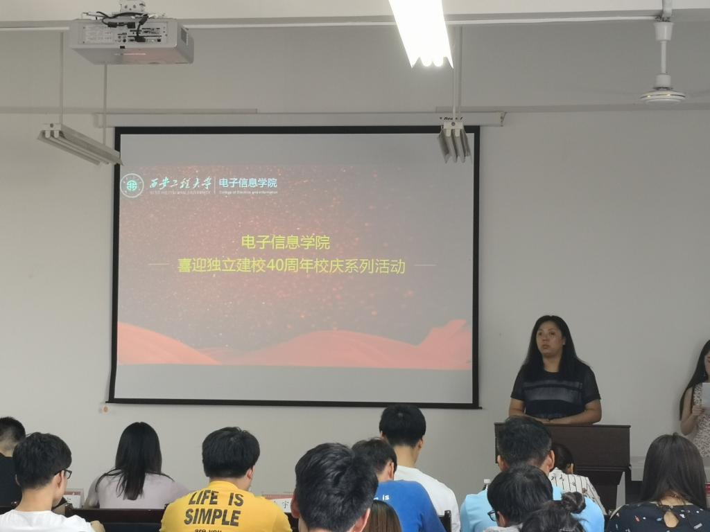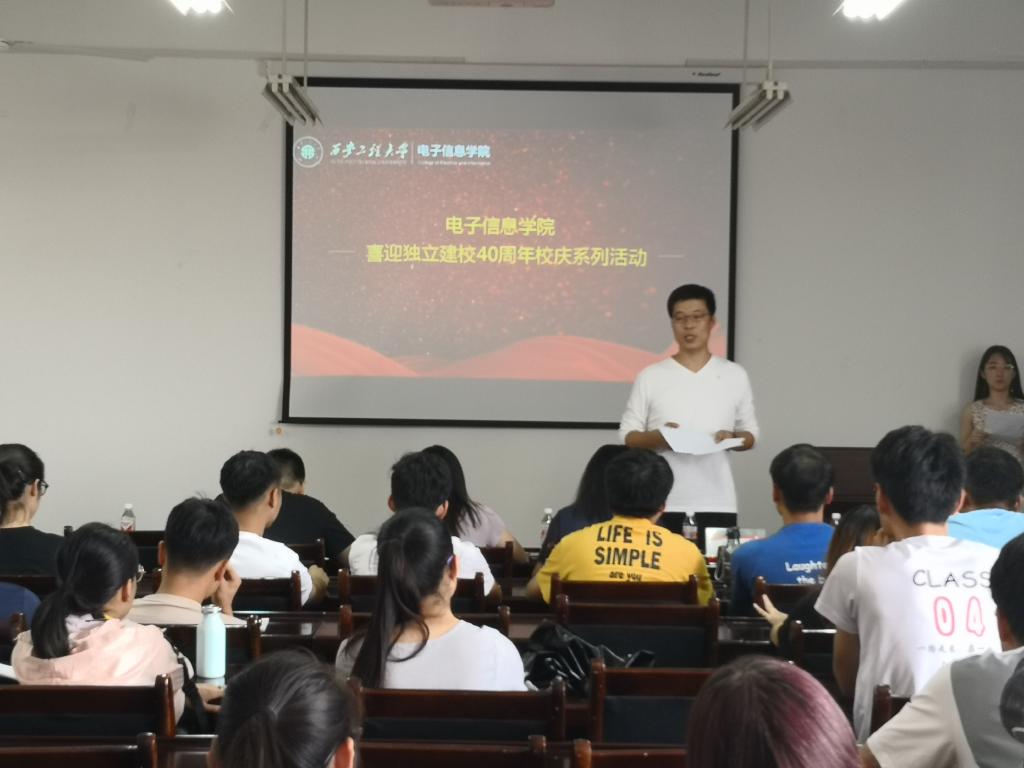 为更好的迎接我校独立建校40周年校庆,展示电子信息学院学子的精神风貌。电信学院于6月11日中午在临潼校区电信楼419会议室举办“喜迎我校独立建校40周年校庆系列活动”动员大会。电信学院学工办主任朱宇军、团总支书记刘妍萍、辅导员赵立涛、曹智宇、刘风萍及各班团支部成员,团学科全体学生干部参与本次活动。