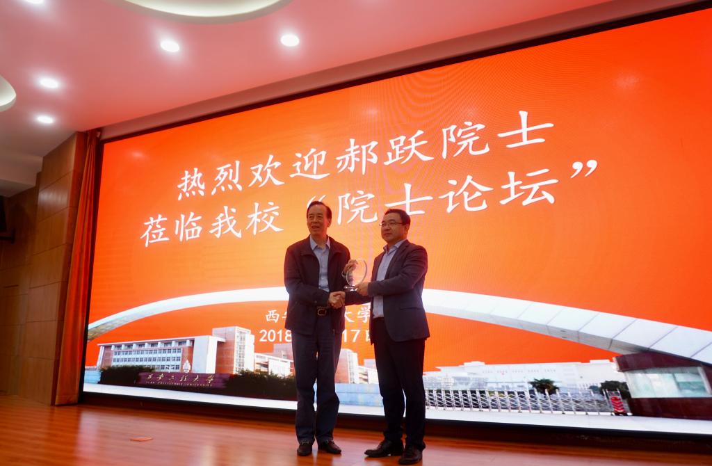 2018年9月17日下午三点,为迎接西安工程大学独立建校40周年校庆,我校在临潼校区图书馆一层报告厅举办首期院士讲坛,电信学院邀请中国科学院院士、西安电子科技大学教授郝跃教授做了主题为“从信息技术谈创新与发展”的学术报告会。本次报告由校长朱永民主持,报告会开始校长高岭为郝跃院士颁发了纪念品。科技处副处长朱耀麟、电信学院党委书记杨恩科、执行院长景军锋、副院长李云红等教师和研究生共200余人参加。