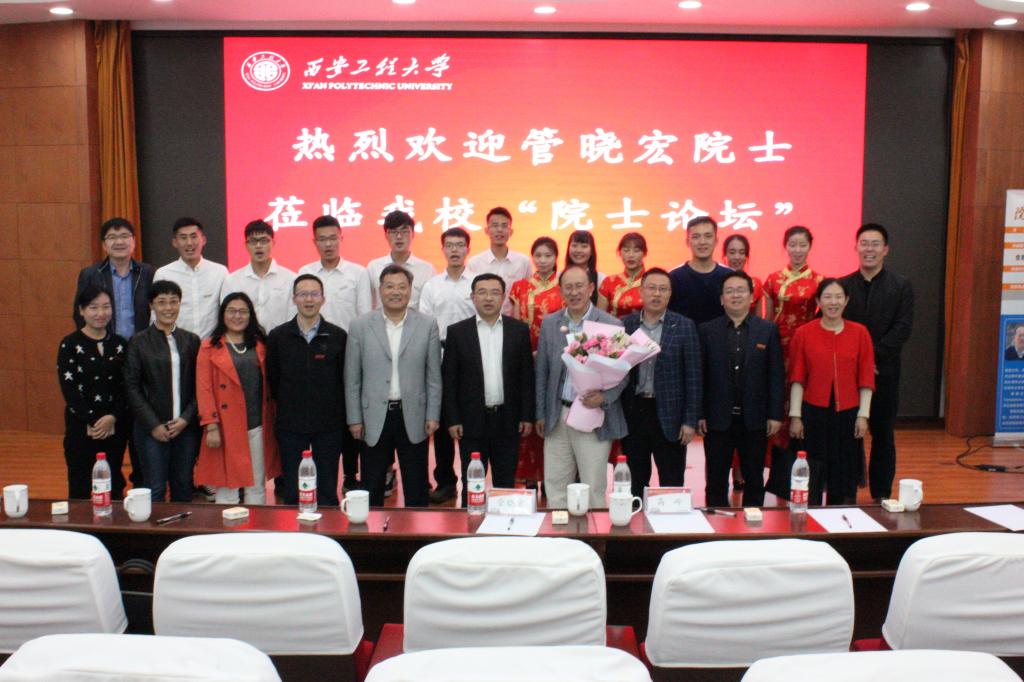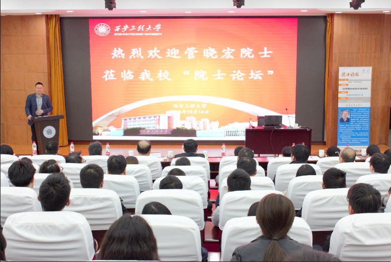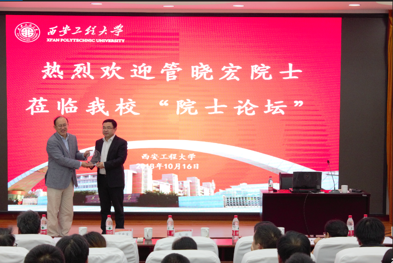 “院士论坛”是我校办学106年,独立建校40周年纪念活动中学术交流板块的重要内容,会前,高岭为管晓宏院士颁发了“西安工程大学独立建校40周年院士论坛”纪念牌。紧接着管院士开始了他的学术报告。