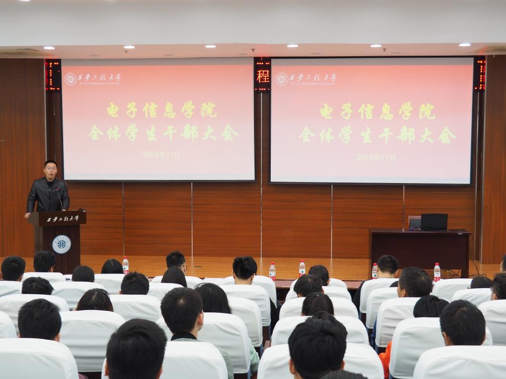 为加强学院学生干部队伍建设,提升学生干部的综合素质,为学院学生工作提供有力保障,11月1日中午,电子信息学院于临潼校区图书馆二楼报告厅举办2018年全体学生干部大会。电子信息学院党委副书记刘许,学生办公室主任朱宇军,团总支书记刘妍萍,全体辅导员,各年级班级骨干、党支部学生代表、团学科全体学生干部两百余人参加了本次大会。大会由周梦宇主持。
