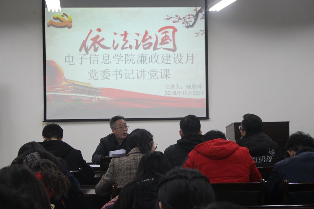为了加强学生党员的廉洁教育,有力推进学院学风建设工作,按照校纪检委第五届廉政宣传教育月活动安排,2018年11月22日晚上7点,在临潼校区电子信息楼419教室,电子信息学院党委书记杨恩科给学院学生党员上了一堂题为 “以共产党人的浩然正气,引领党风廉政和学风建设”的廉政党课,学院80余名学生党员聆听了此次党课。