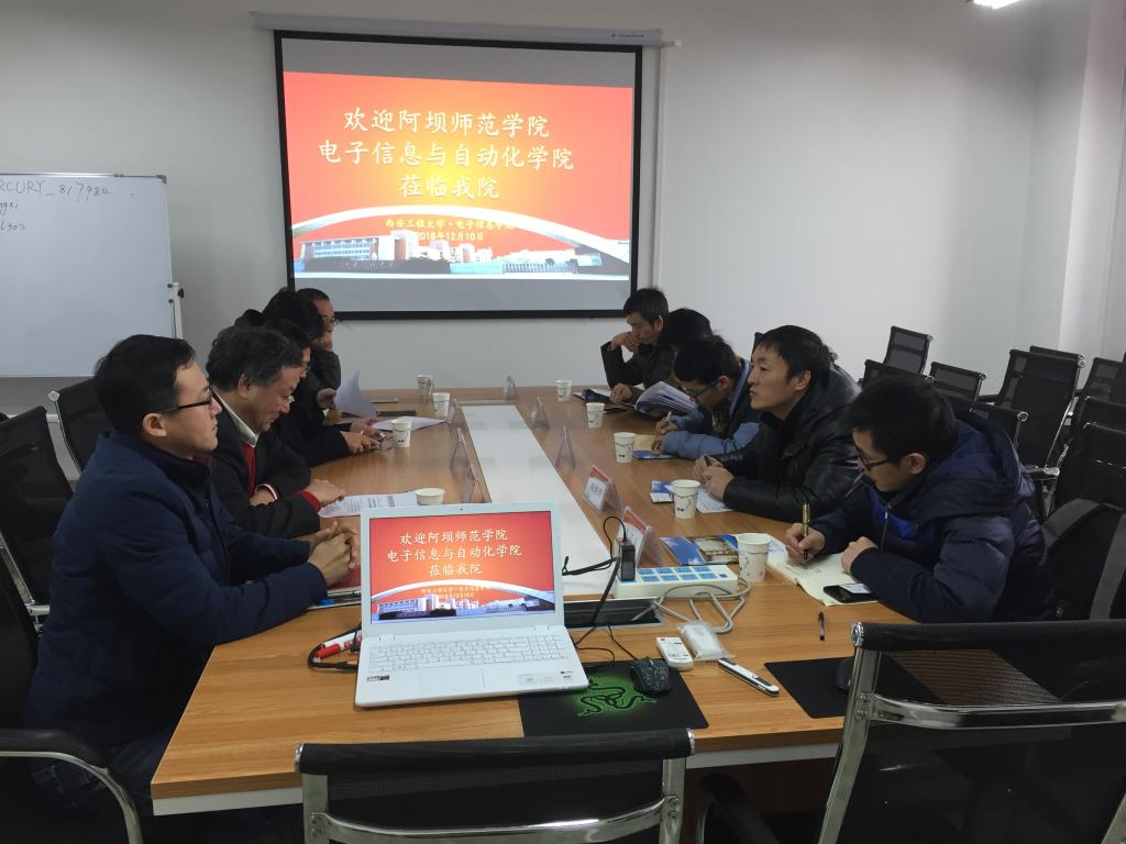 会上,赵广社对阿坝师范学院各位老师的到来表示欢迎,并对电信学院的基本概况、历史沿革、师资队伍进行了简单的介绍。随后朱磊和刘毅力分别电子信息工程专业和电气工程及其自动化专业的专业设置、培养方案设置、工程教育认证等方面进行了介绍。李彦斌对学院的实验室设置、日常管理、实验室教学等方面、实验设备维修管理等方面进行了介绍。