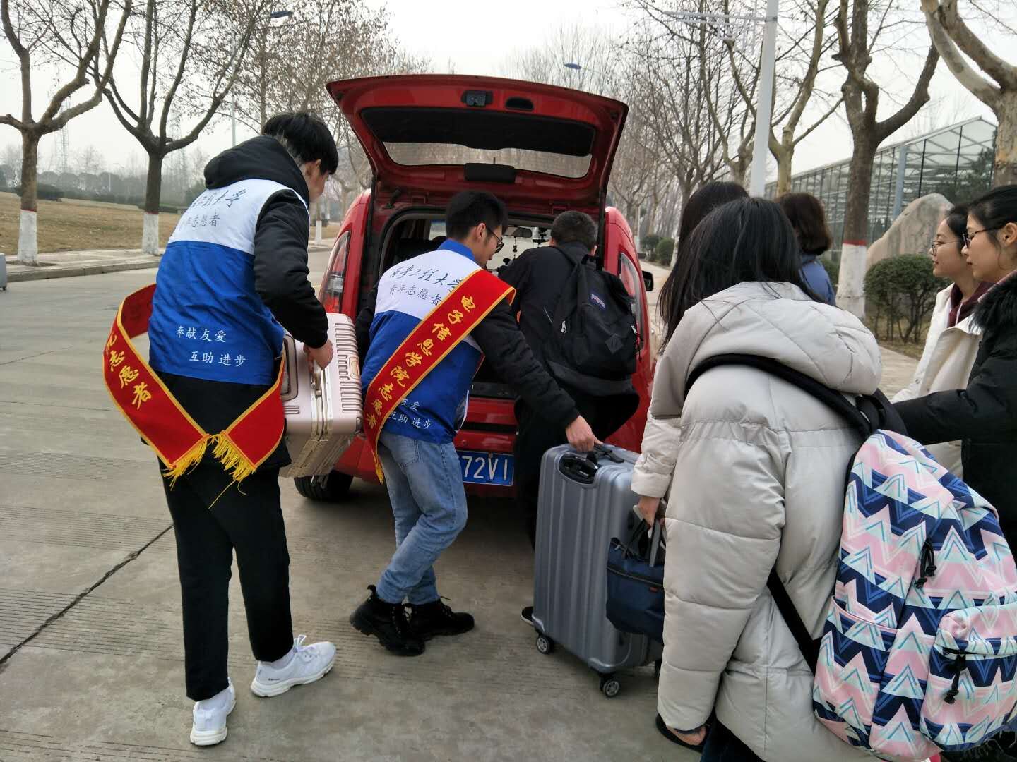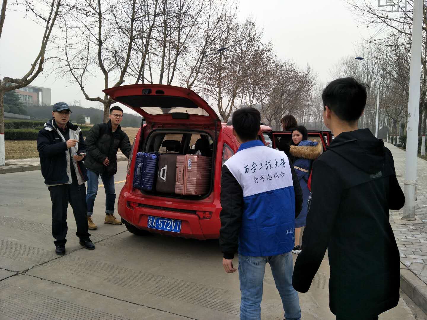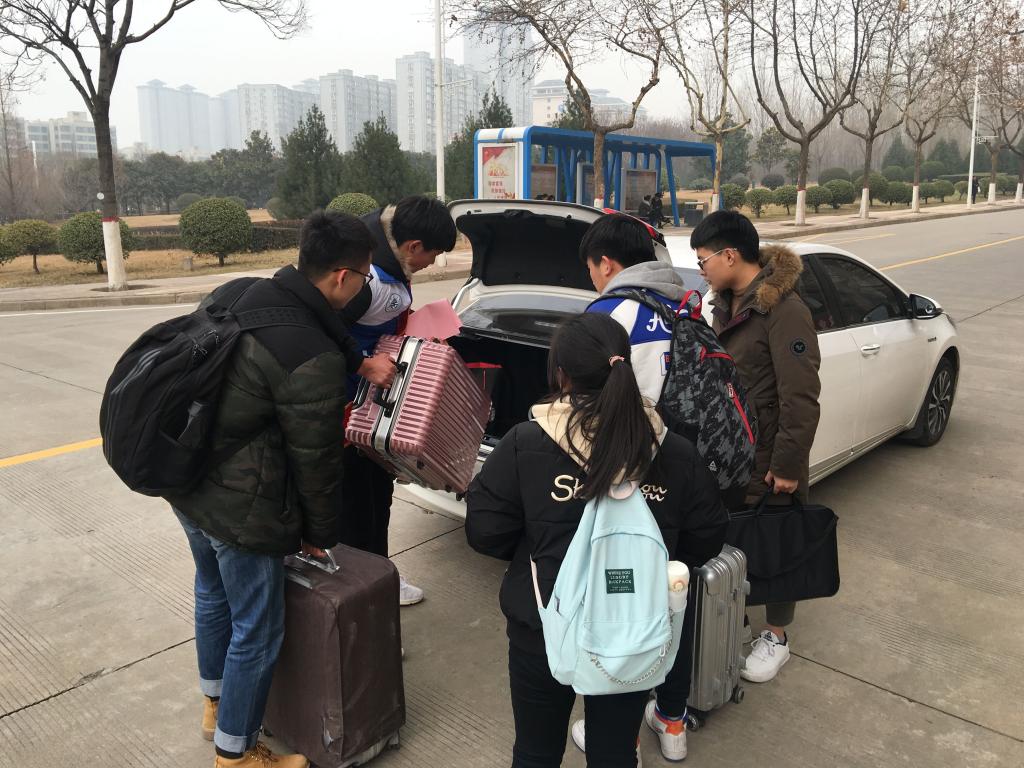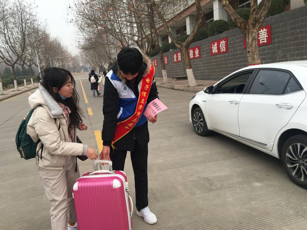 2月24日,我校两位热心的老师工程训练中心孟建华、电子信息学院周梦宇在校临潼校区北门,用私家车接送返校的同学们从学校北门到各学生公寓,还有来自电信学院的志愿者同学将返校学生有序带到指定的乘车地点,帮他们搬行李。
