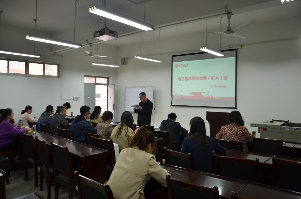 2019年4月10日下午,电子信息学院在院419多媒体教室召开党委(扩大)会议,传达学习学校近期重要会议精神及安排部署党风廉政建设、稳定安全综合治理等工作。学院全体党委委员,党委理论学习中心组成员,系(部)、办公室主任及全体支部书记参加了此次会议,会议由电子信息学院党委书记杨恩科主持。