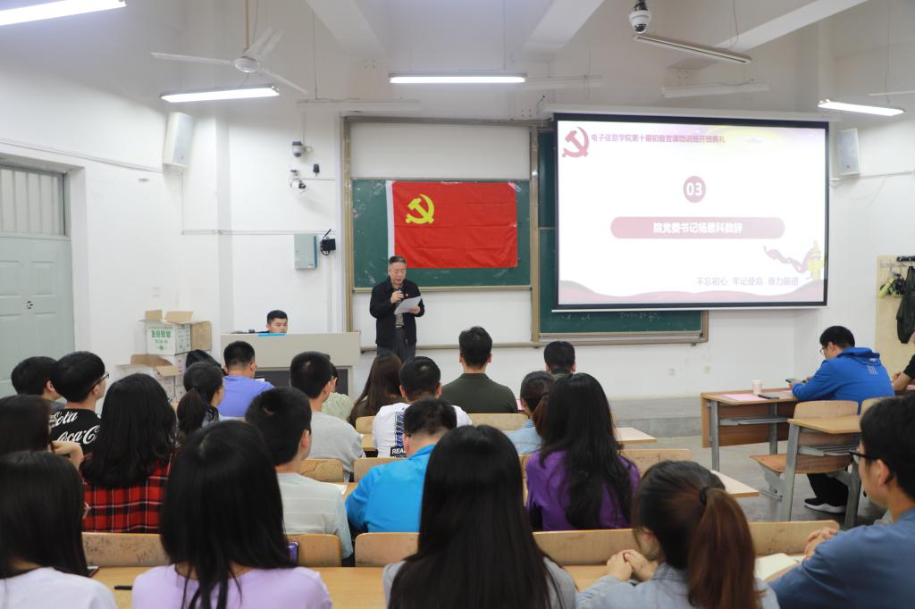 2019年5月16日,电子信息学院党委在临潼校区教学楼B135教室隆重举行第十期初级党课培训班开班典礼。学院党委书记杨恩科、副书记刘许、学院各党支部书记及174名学员参加了此次典礼,大会由院党委委员朱宇军主持。