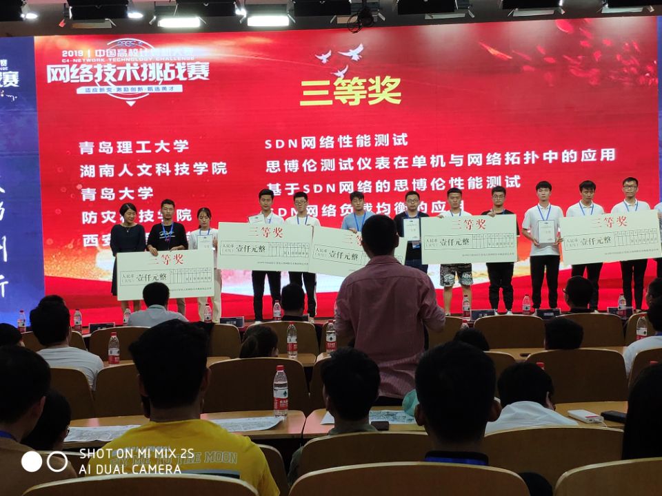 本次大赛全国共有313所院校、1206支队伍、4903名学生参加竞赛,参赛规模较去年翻番,其中包括清华大学、浙江大学、上海交通大学、国防科大、电子科技大学等知名高校。大赛经过资格赛和选拔赛,有84件作品参加在温州大学举办的全国总决赛。我校电子信息学院教师苏军、计算机科学学院教师赵旭指导的我校董凯、张晨飞、胡俊华、陈恬静等4名同学的作品《基于SpirentTestCenter的SDN校园网的部署测试实现》获全国三等奖。