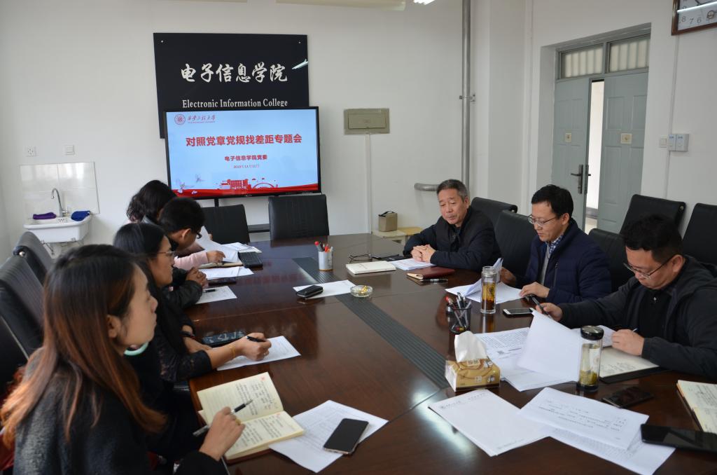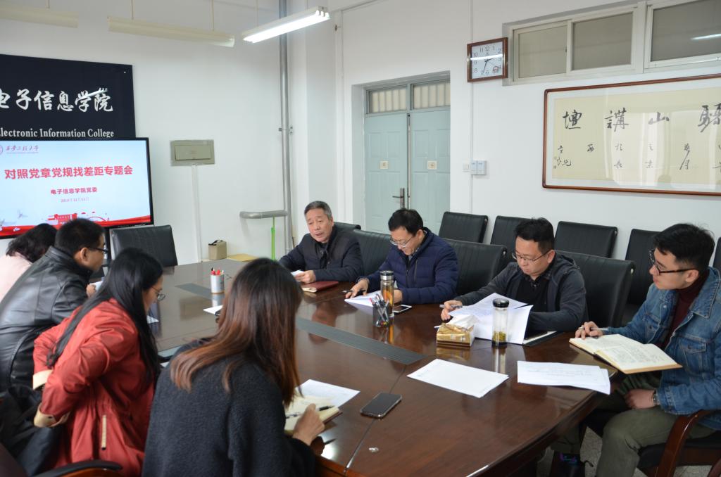 2019年11月11日下午2点,电子信息学院党委坚持以习近平新时代中国特色社会主义思想为指导,结合“不忘初心、牢记使命”主题教育,召开对照党章党规找差距专题会议。党委书记杨恩科主持会议,执行院长景军锋,副院长李云红,副院长张蕾,党委副书记刘许,学院办公室主任孙宁,学生工作办公室主任朱宇军出席会议。