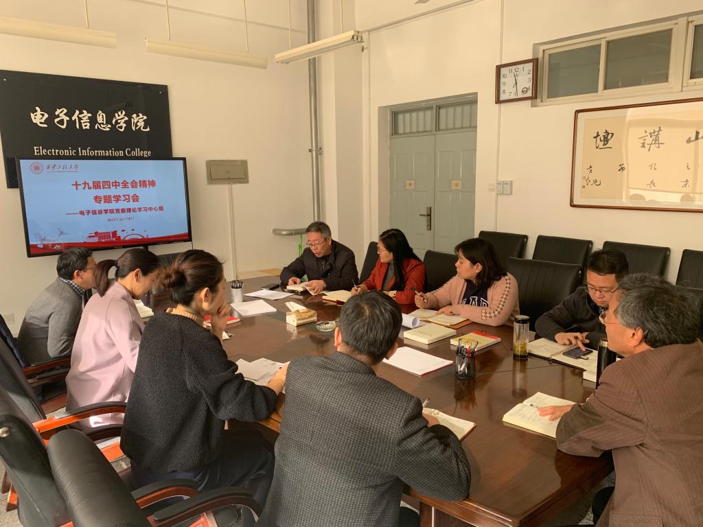 11月18日上午11:00,在电信楼414会议室,电子信息学院党委理论学习中心组召开专题学习会,集中学习党的十九届四中全会精神,学院党委理论学习中心组全体成员参加了会议。会议由院党委书记杨恩科主持。
