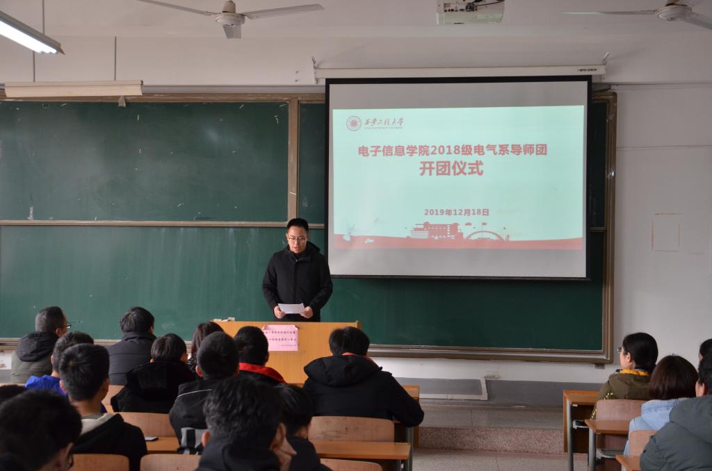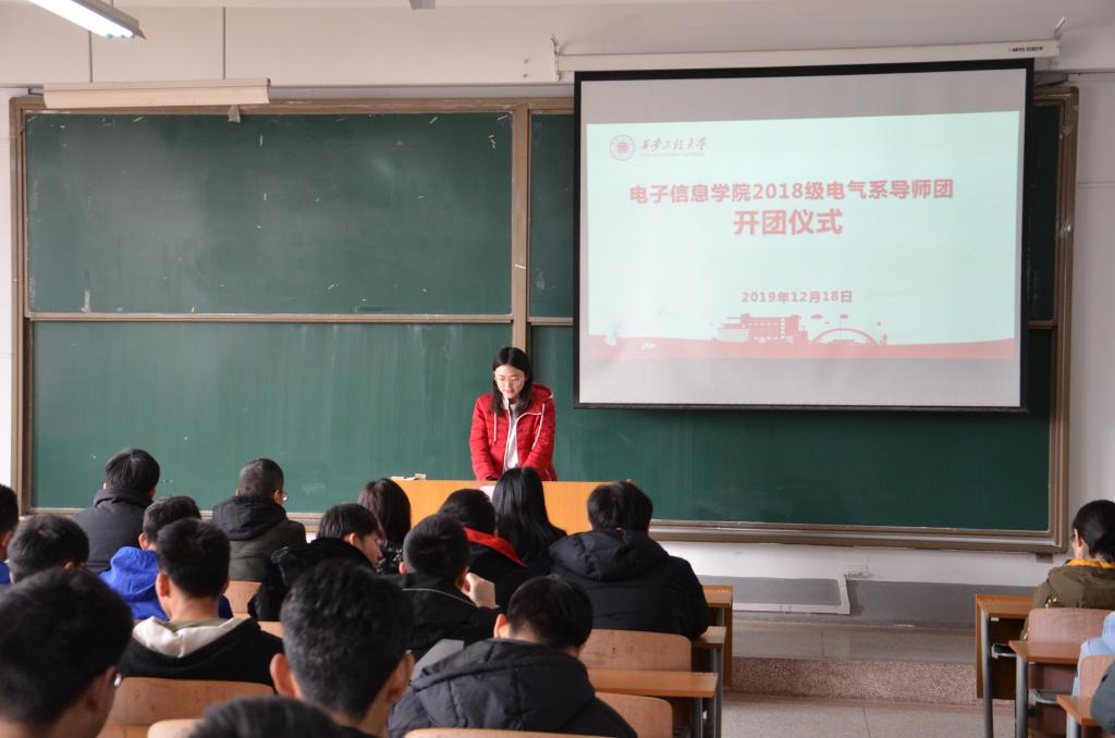 为深入贯彻落实中共中央、国务院《关于加强和改进新形势下高校思想政治工作的意见》精神,促进“三全育人”综合改革工作,提高人才培养质量,电子信息学院于2019年12月18日下午召开了2018级电气系三全育人导师团开团仪式。参加本次会议的有电气系系主任导师团执行团长刘毅力,电气系教师郭昆丽、杨昊、电子电工部教师吴圆,辅导员周梦宇及2018级电气系全体学生。本次活动由周梦宇主持。