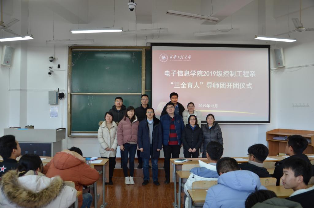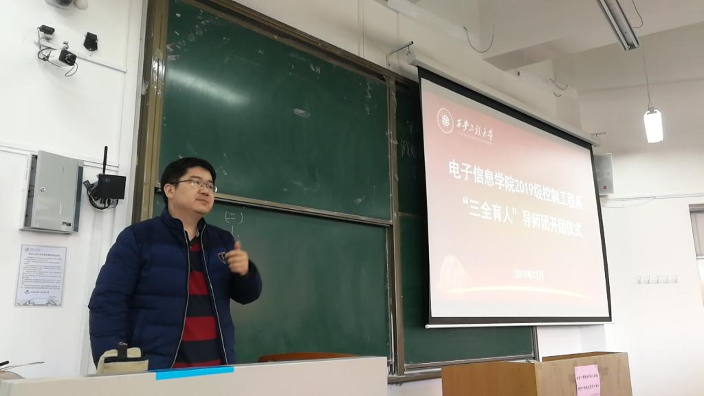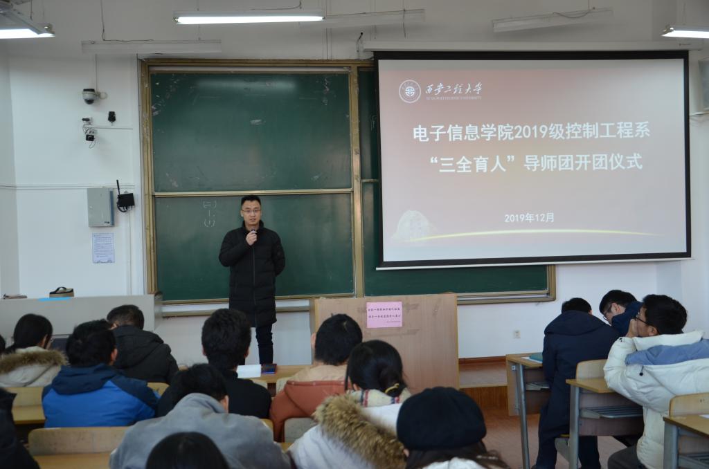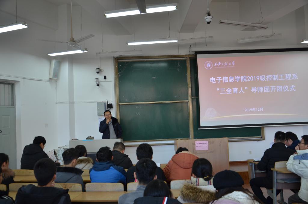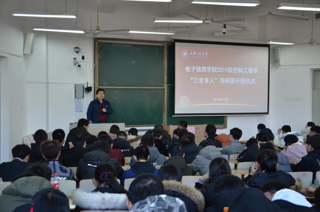 2019年12月26日中午,电子信息学院在教学楼B座135室召开了2019级控制系“三全育人”导师团开团仪式。电子信息学院执行院长、导师团团长景军锋,科技处副处长王志刚,导师团导师武桐、张宏伟、陈丹亚、陈小改、王敏、卢嫚、苏泽斌及2019级自动化专业1-2班、2019级机器人工程专业1-2班、2019级测控技术与仪器专业1班全体学生,共计170余人参加仪式,开团仪式由导师团秘书、研究生辅导员赵立涛主持。