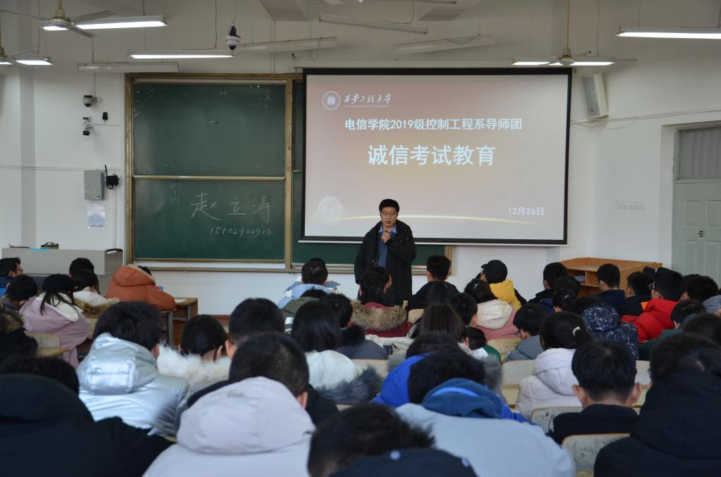 为严肃考风考纪,提高学生的诚信意识,进一步加强学院学风养成。电子信息学院于12月26日在教学楼B135召开2019级控制系导师团召开考试诚信教育大会。会议由赵立涛老师主持,2019级控制系全体学生163人聆听会议内容。