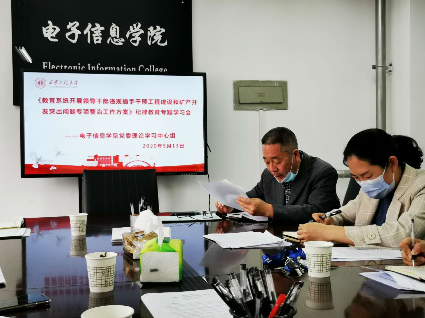 为贯彻落实党要管党、全面从严治党要求,5月13日下午,在临潼校区电信楼414会议室,电子信息学院党委理论学习中心组召开纪律专题学习会,传达学习《教育系统开展领导干部违规插手干预工程建设和矿产开发突出问题专项整治工作方案》。会议由学院党委书记杨恩科主持,学院党委理论学习中心组全体成员参加了会议。