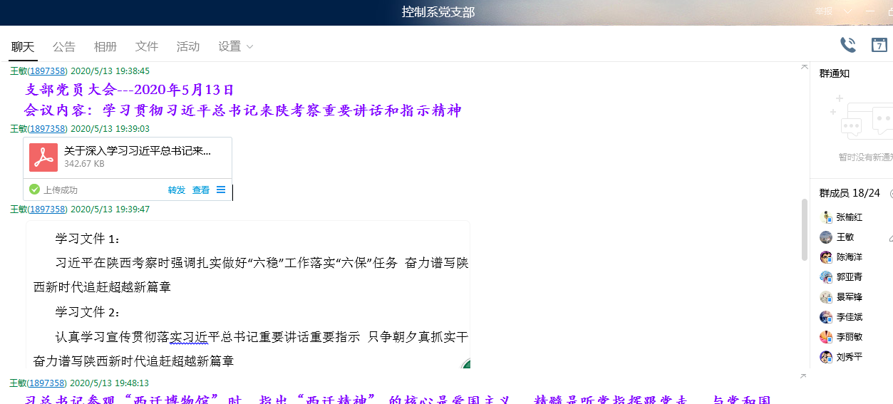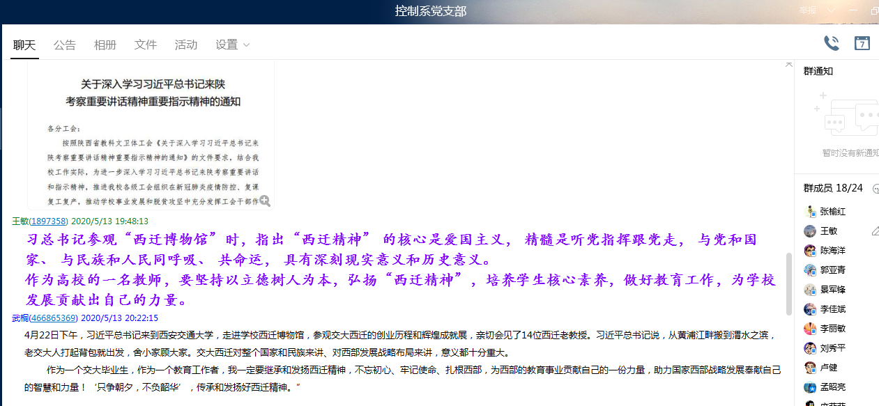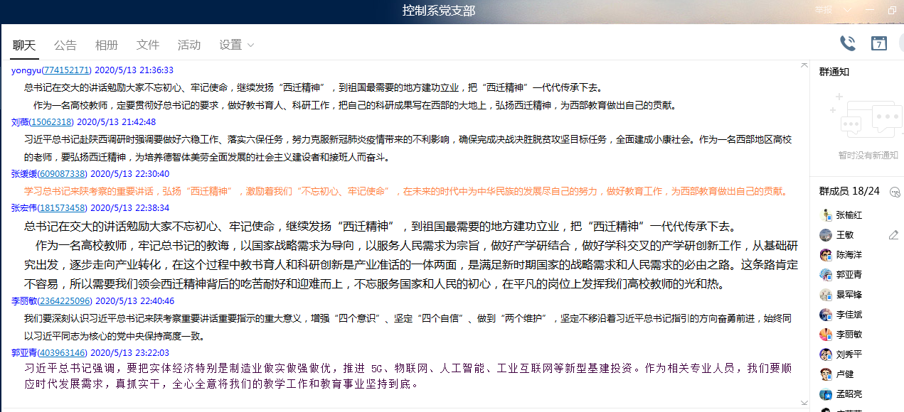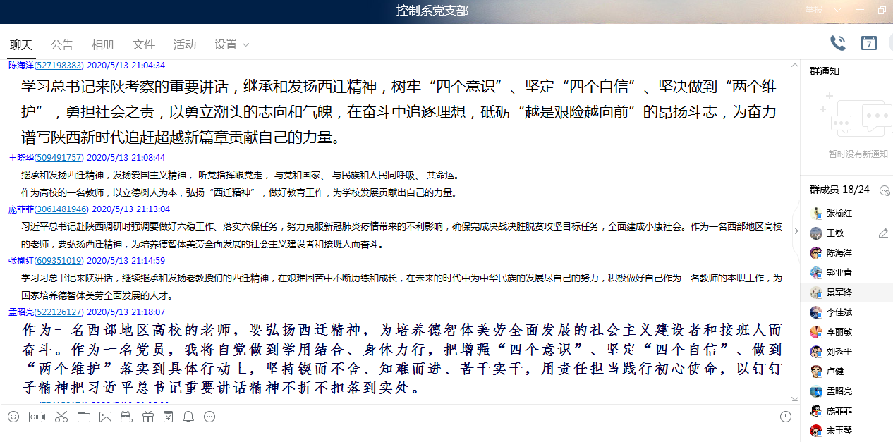 5月13日晚7点,全国样板党支部电子信息学院控制系党支部在支部QQ群线上开展了“习近平总书记来陕视察重要讲话重要指示精神”专题学习会。会议由支部副书记王敏主持,控制系全体党员都参与了学习,并发表学习感言。