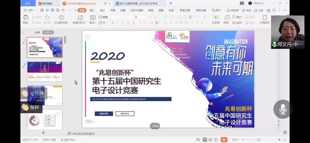 为确保疫情防控期间研究生创新能力锻炼不断线,电子信息学院积极推进中国研究生电子设计竞赛(以下简称:研电赛)的参赛筹备相关工作。经电子信息学院积极向研电赛组委会申请,于2020年5月25日14:00—17:00顺利举办了“兆易创新杯”第十五届线上宣讲会西安工程大学专场宣讲会。研电赛组委会秘书、中国电子学会何文丹、兆易创新市场部大学计划专员马晓路、MathWorks中国学生竞赛专员汪丽萍、电子科技大学副教授黄乐天等嘉宾参加了宣讲会,电信学院副院长张蕾、李云红以及我校电信学院、机电学院、计算机学院、纺织学院等学院教师、研究生200余人参加了此次宣讲会,会议由组委会秘书何文丹主持。