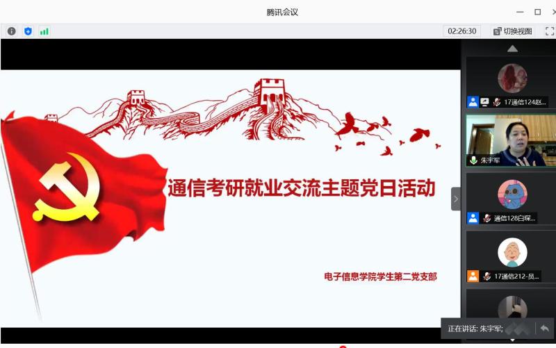 为进一步加强学风建设,坚持党建引领,充分发挥基层党组织战斗堡垒作用和党员示范引领作用,电子信息学院学生第二党支部于6月10日晚7点在腾讯会议平台上召开通信专业考研就业经验分享交流会。支部邀请了16级毕业生黄强、令红娜、白晨阳和薛宇四位同学分享交流他们的考研就业经验。支部书记朱宇军和17、18级通信专业的80余名同学参加了会议,党员赵艺萱主持会议。