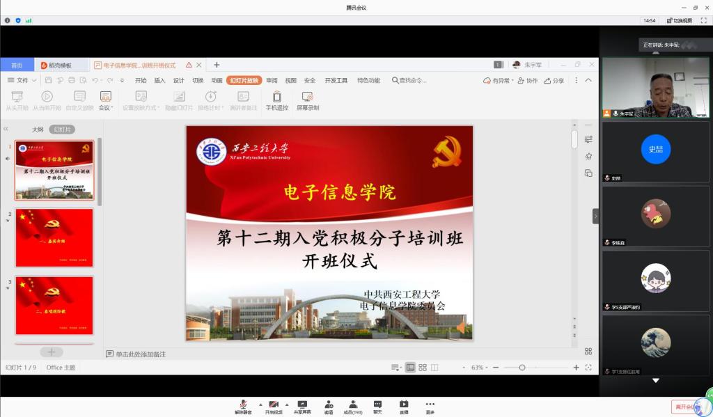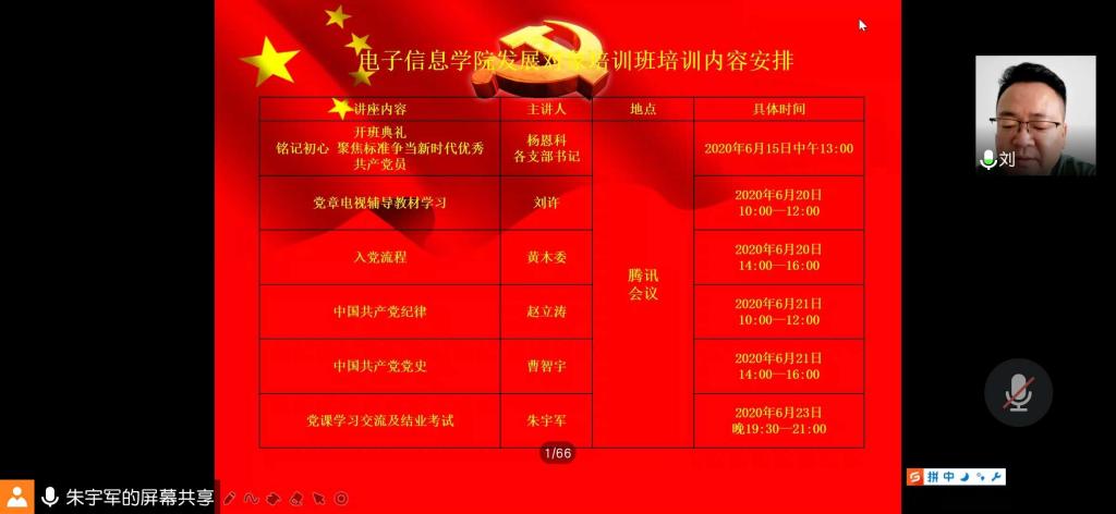 为了做好入党积极分子的培养教育工作,提高党课学习的积极性和主动性,2020年6月15日中午1点,电子信息学院党委在腾讯会议网络平台上举行了学院第十二期入党积极分子培训班开班典礼。院党委书记杨恩科、党委副书记刘许、各党支部书记及185名入党积极分子参加了此次典礼,大会由学院学工办主任朱宇军主持。