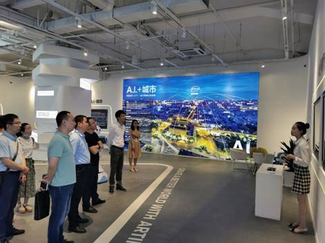 首先,景军锋一行参观了科大讯飞人工智能展厅,详细了解了科大讯飞人工智能业务板块,亲身体验了科大讯飞人工智能核心技术在教育、医疗、政法、城市等领域的创新应用成果,并与相关工作人员进行了技术交流和讨论。