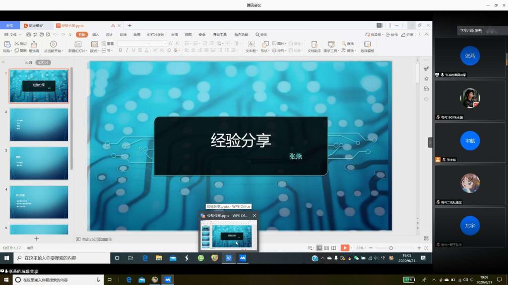 由于疫情影响,经验分享会于线上进行,会议开始,张天介绍主讲学生、开讲目的以及对同学们的期待。随后, 2017级电气专业获奖学生张燕分别从四个方面向学弟学妹们讲述个人的学习经验和心路历程。张燕告诫学弟学妹们要学会争取机会,不断锻炼个人能力,在学习方面,她认为选择舒适的学习环境,状态最佳的时间段以及个人周密的学习计划是提高学习效率的重要因素,最后张燕建议学弟学妹们要积极参加体育竞赛,锻炼强硬体魄,疫情在家期间也要强身健体。