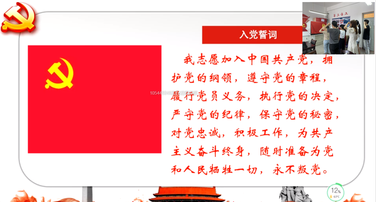 接着,全体党员线上进行了重温入党誓词。全体毕业生党员首先观看了由入党誓词拍摄的视频《我宣誓》,视频中激情澎湃、振奋昂扬的画面及习近平总书记领誓入党誓词的原声,一次次鞭策、提醒着大家,提醒着在场的党员们要自觉履行党员的责任与义务、要主动肩负起新时代赋予我们每一个人的责任与使命!然后在朱宇军的带领下,全体毕业生党员面向党旗,举起右拳,重温入党誓词,表达自己为共产主义事业奋斗终身的理想和信念。