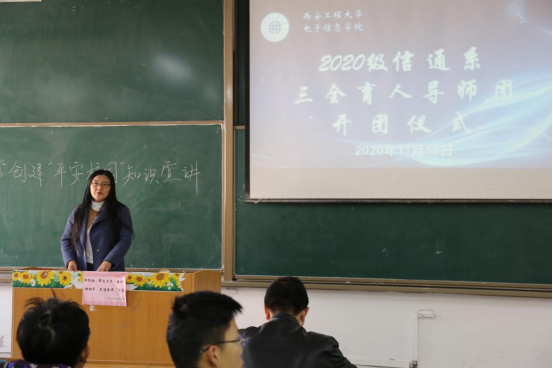 2020年11月18日上午10时,电子信息学院于教学楼D区382室召开2020级信通系三全育人导师团开团仪式,执行团长学院副院长李云红、教务处副处长胡新煜、信通系陈宁、任劼、陈锦妮、宋鹏、邹晓军,招生就业处高远八位导师,2020级电子信息类专业全体学生出席本次开团仪式,仪式由导师团秘书辅导员王家钰主持。