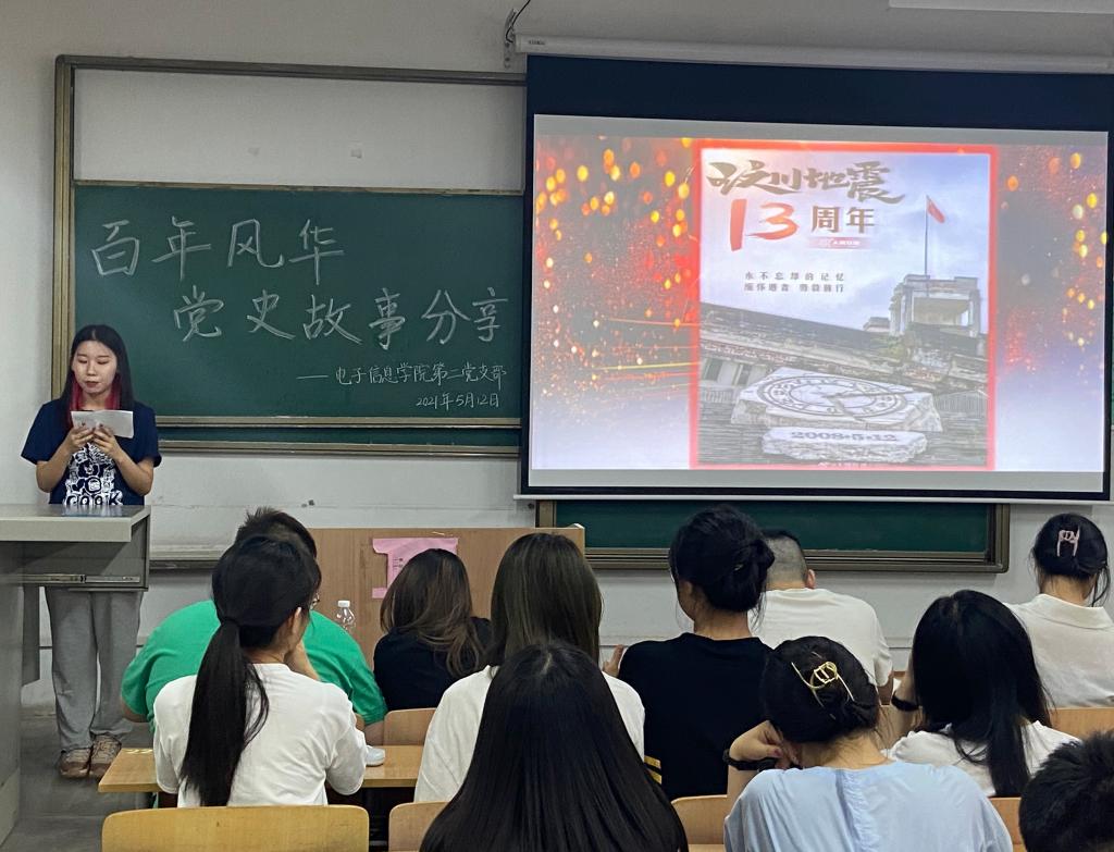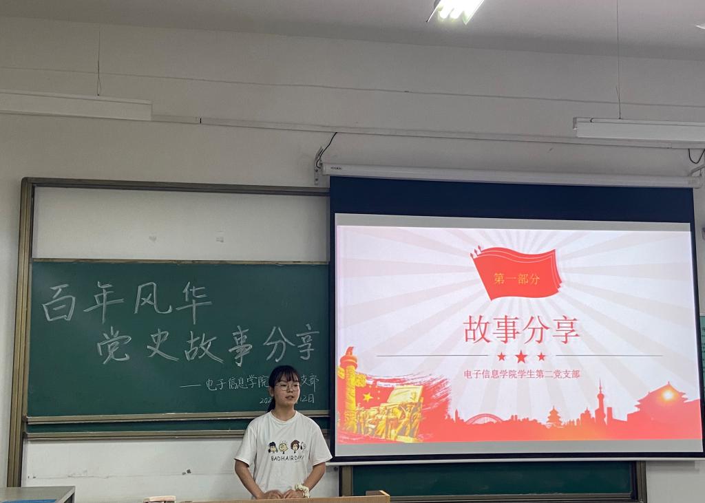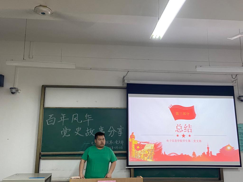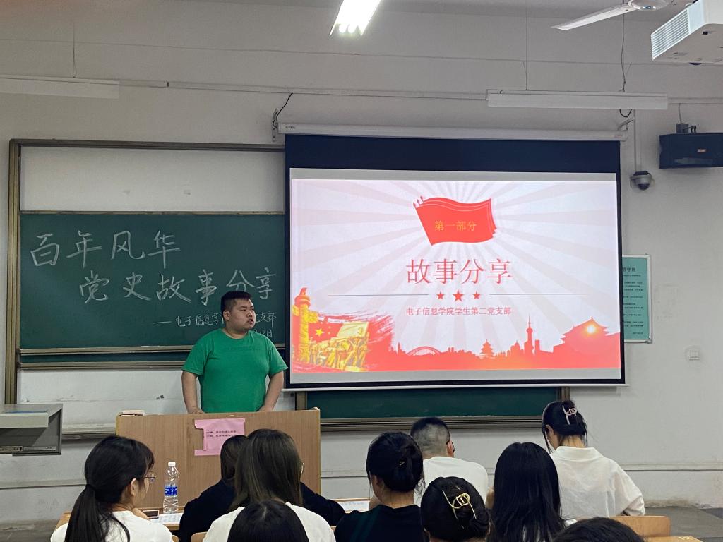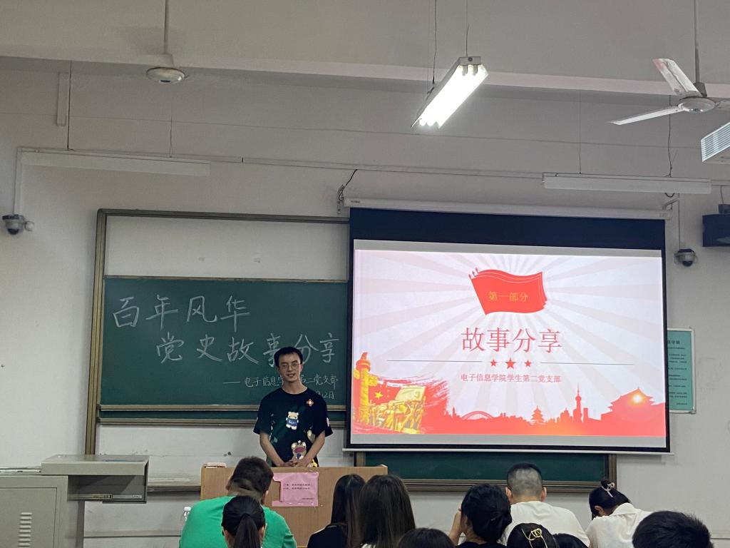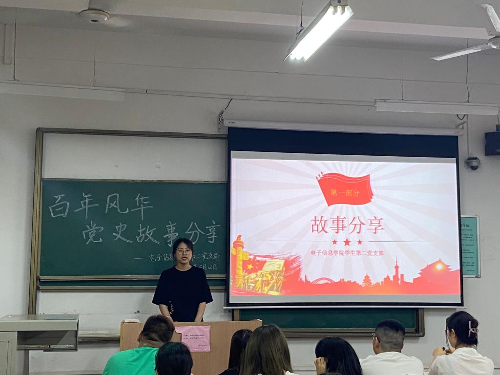 在中国共产党成立100周年的历史性光辉时刻,为扎实开展党史学习教育,积极践行支部“五个一”献礼行动,引导支部党员在学习党史中沐浴红心、滋养初心,强化担当。5月12日晚,电子信息学院学生第二党支部在教学楼A-122开展了“忆红色往昔 承先锋旗帜”红色故事分享主题党日活动,通过党员讲述小故事传递中国共产党的精神和力量。本次活动支部全体党员及部分入党积极分子共同参加。