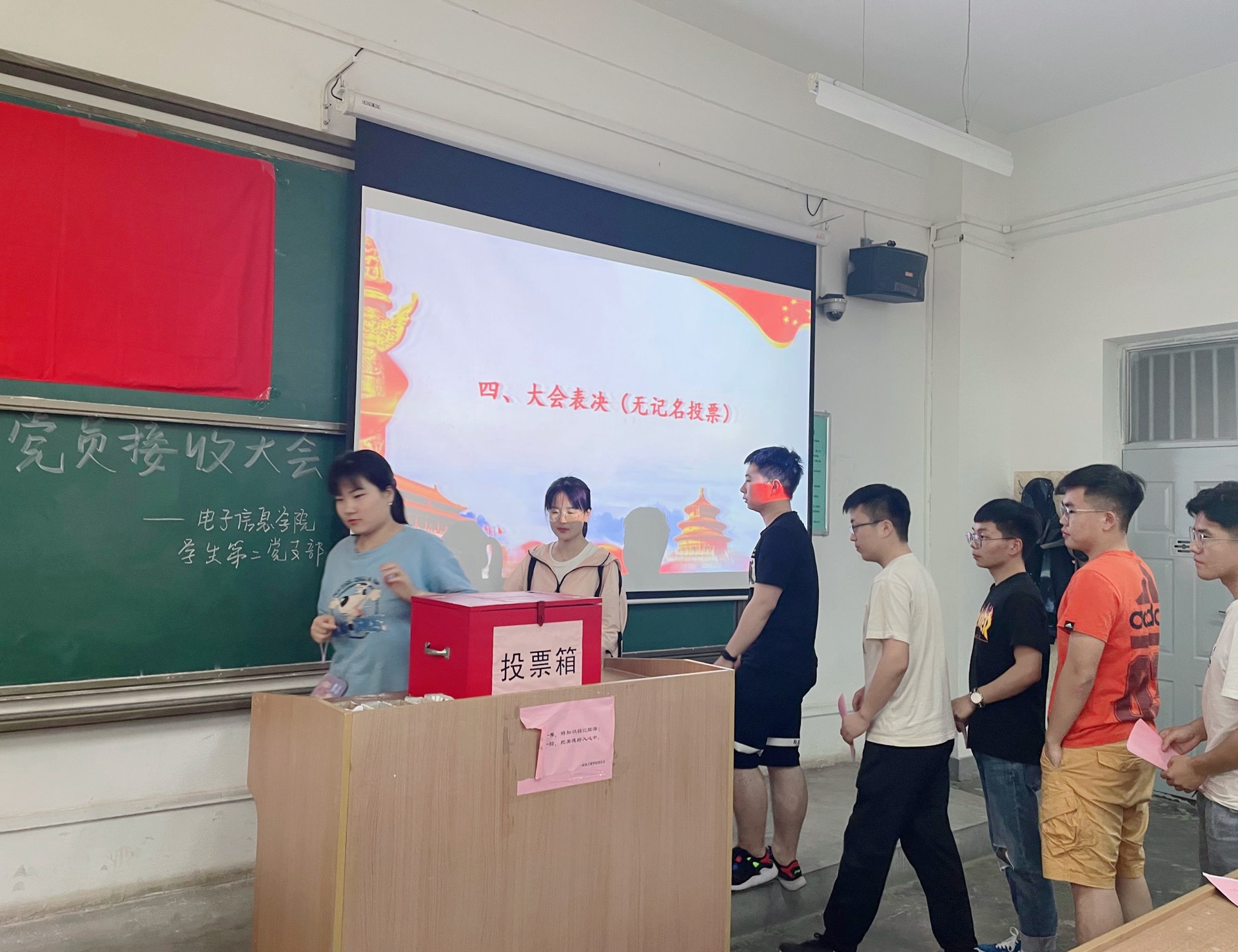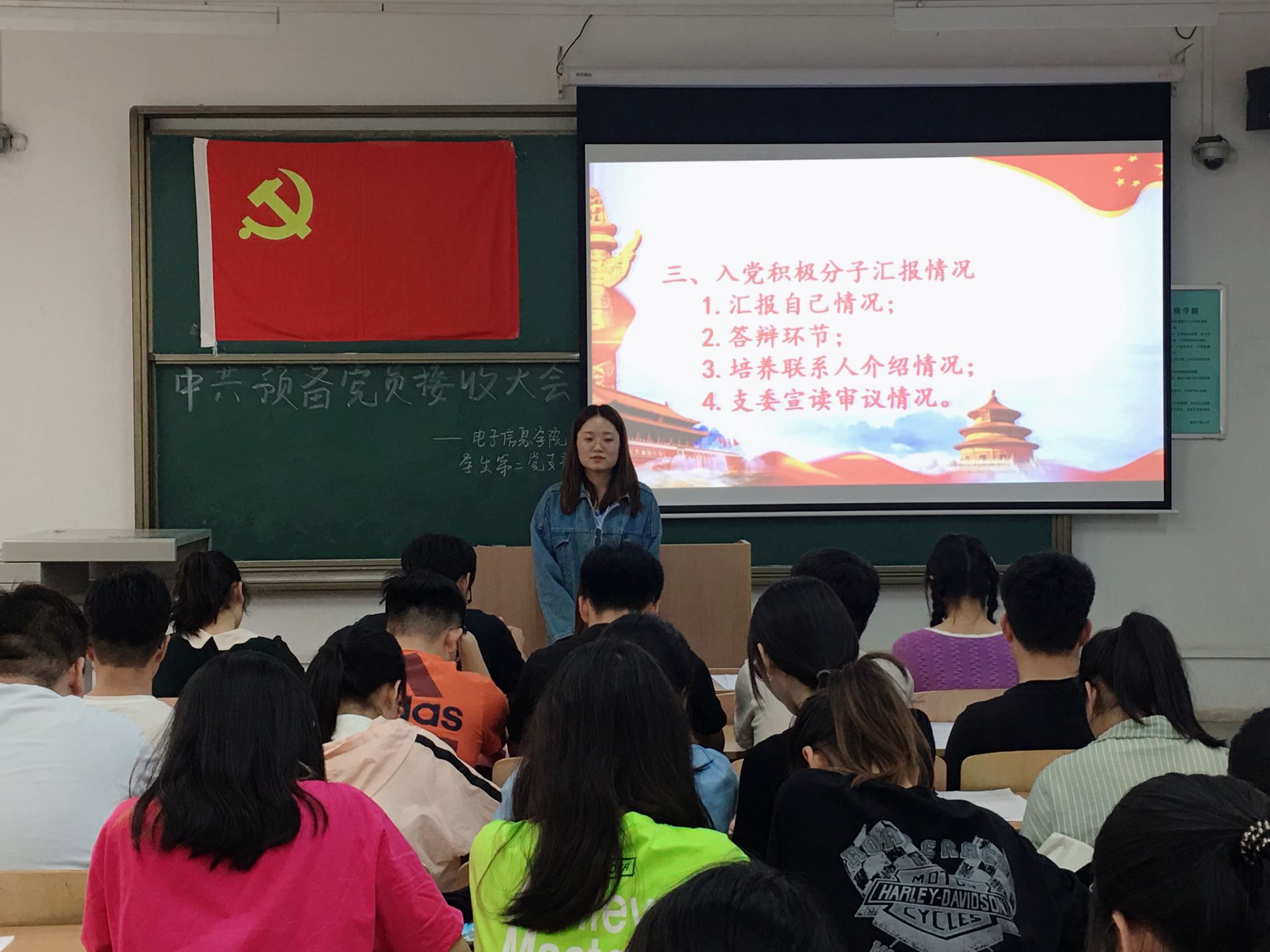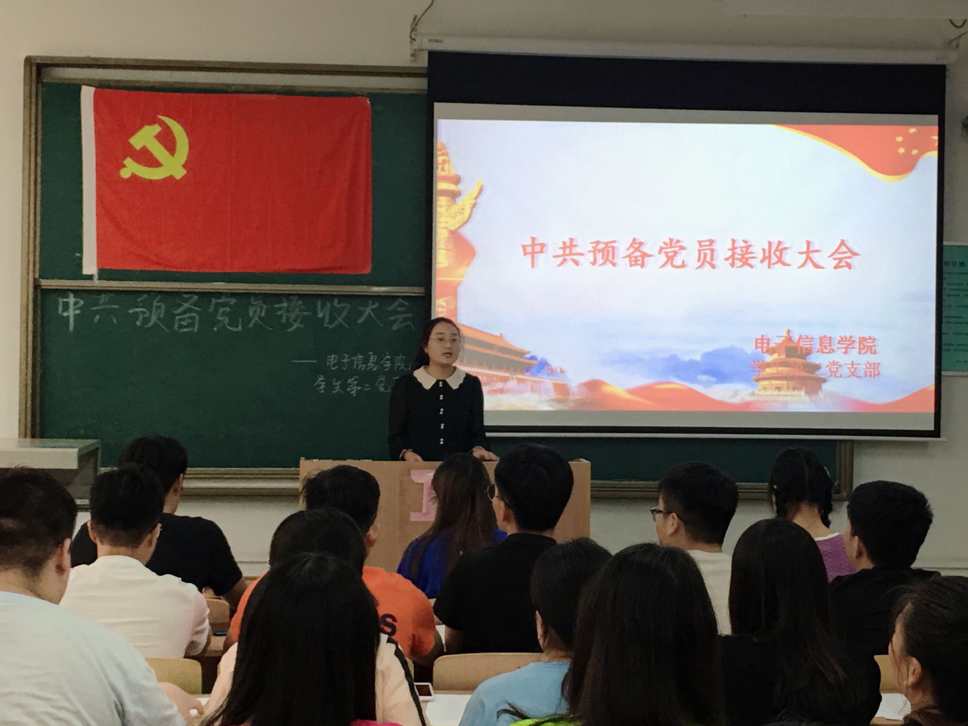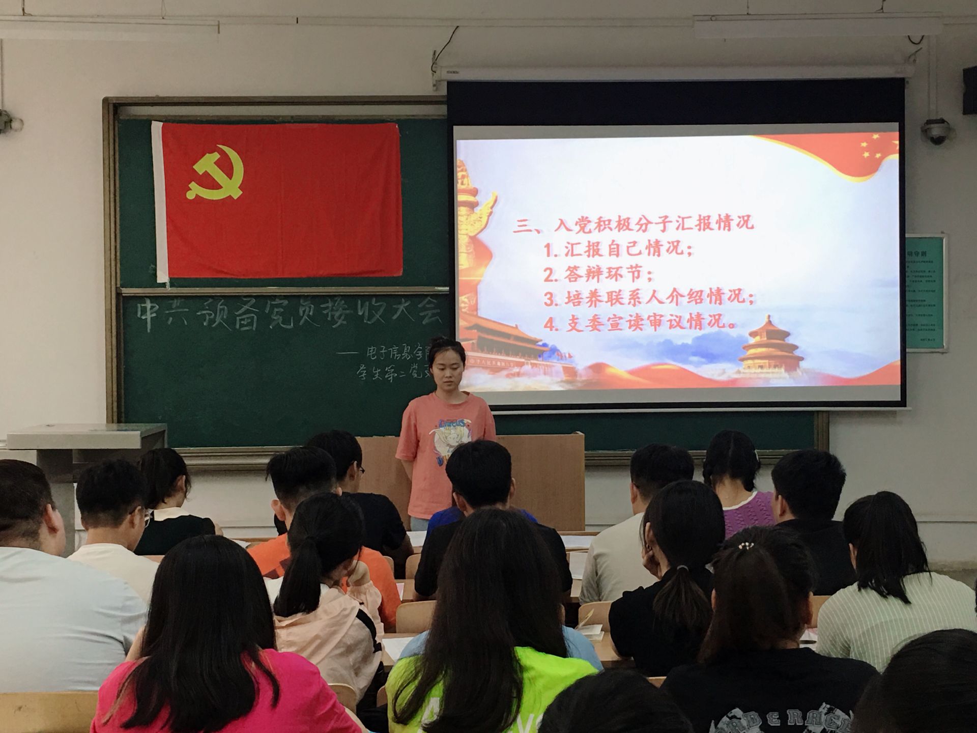 为加强学校基层党组织建设,做好发展党员工作,2021年5月25日下午18:00,电子信息学院学生第二党支部在临潼校区A-112教室召开第60期预备党员接收大会,顺利完成了发展党员工作。本次大会由党支部书记刘风萍同志主持,第60期发展对象以及支部全体党员按时参加。