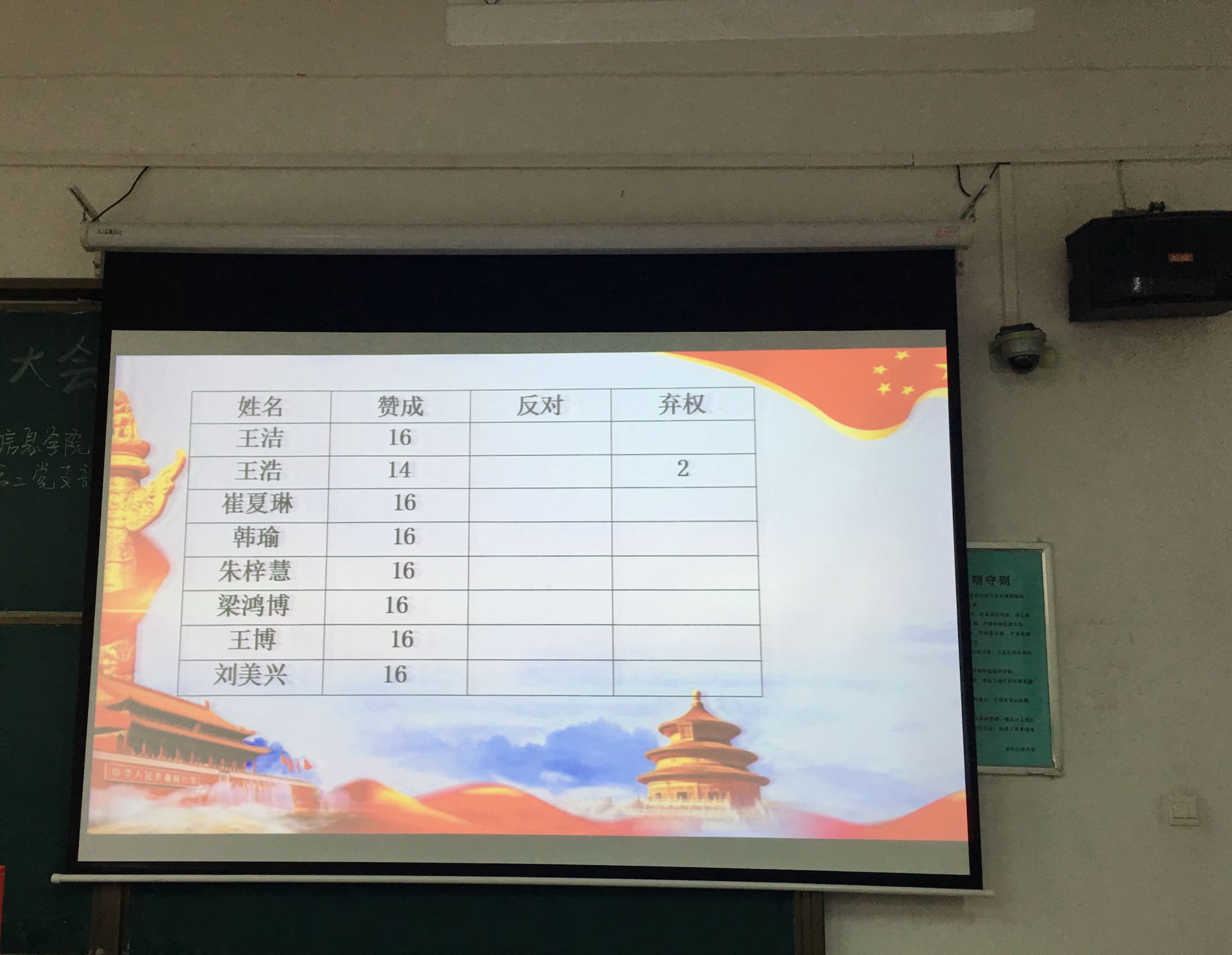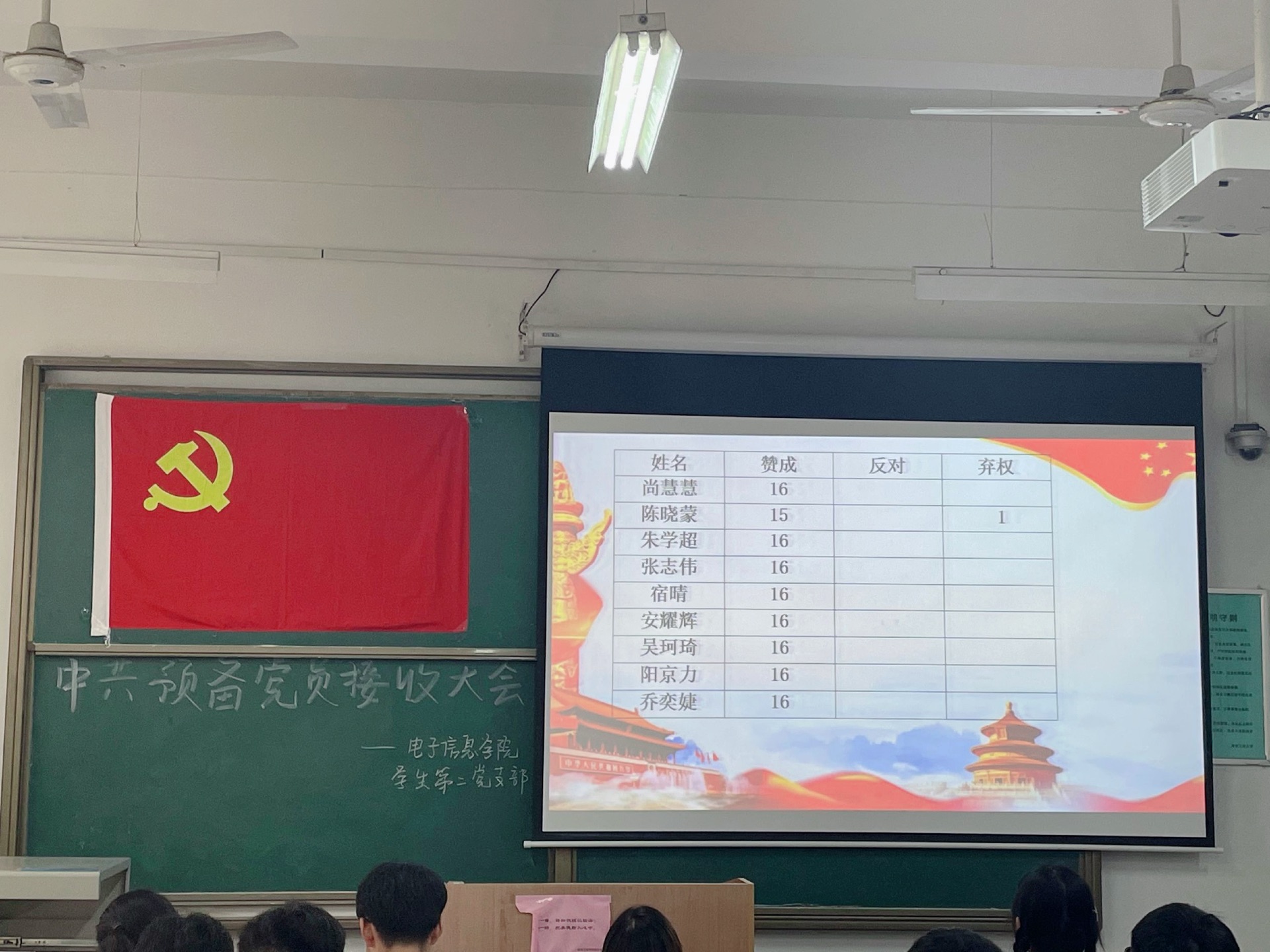 王洁、王浩等17名发展对象依次上台发言,从思想态度、生活、学习、工作等方面汇报了自己的实际情况,同时表达自己加入中国共产党的态度和决心,并认真回答了正式党员提出的问题。之后,各位发展对象的入党介绍人分别对他们作出总结性评价,介绍其在思想、学习、生活、工作上的优缺点,并表达了是否建议接收为预备党员的观点。支部全体正式党员综合考虑各发展对象的表现,进行无记名投票,经大会投票表决,王洁、王浩等17名同志全票通过支部大会讨论,接收为中共预备党员。