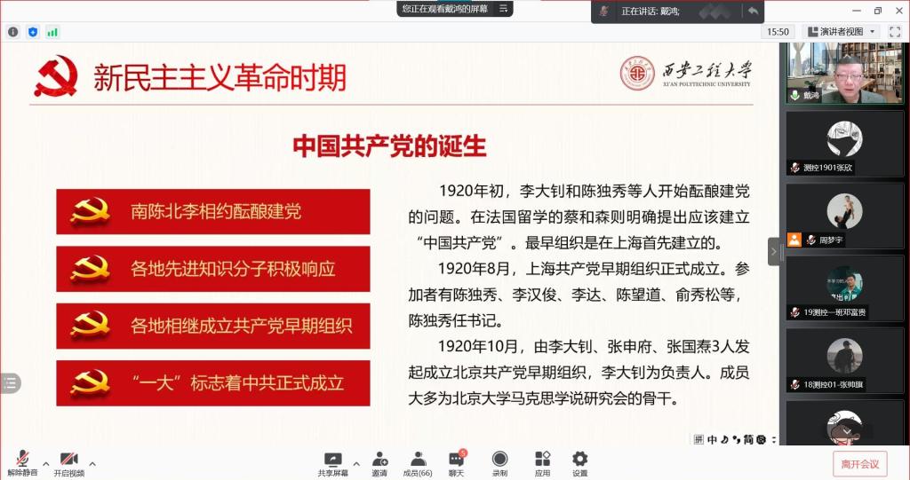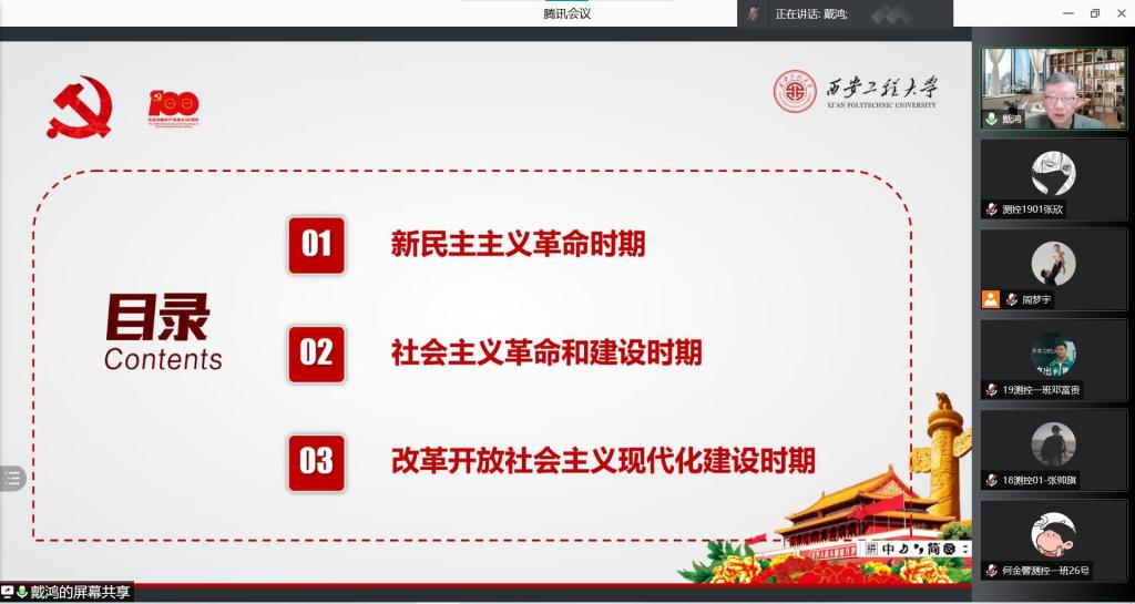 戴鸿以“回首百年奋斗路,启航新征程”为题,以时间为脉络,讲授了党的百年奋斗史,从新民主主义时期、社会主义革命和建设时期以及改革开放社会主义现代化建设时期这三个时期讲述中国共产党的发展,回首百年的艰辛与辉煌,从一大到十九大再到现在的百年征程,中国共产党走过了整整一百年的历程,这是用鲜血、汗水、泪水、勇气、智慧和力量写就的百年,是披荆斩棘、艰苦创业、砥砺前行、充满艰险的百年,逐步实现救国兴国富国强国的奋斗目标,是中国共产党百年的庄严使命。