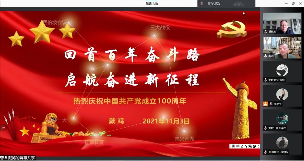2021年11月3日下午,副校长戴鸿为电子信息学院师生党员讲授了《回首百年奋斗路,启航奋进新征程》 的专题党课。本次党课由学院党委书记杨恩科同志主持,学院党委理论学习中心组成员,各党支部书记,教工支部、人工智能专业本科生党支部部分师生党员共同聆听本次党课。