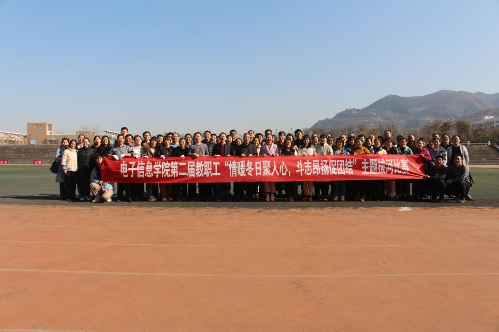 为丰富教职工文体生活,增强学院凝聚力,激发学院教职工参与体育健身的积极性,电子信息学院于2021年11月24日,在临潼校区东环体育场举行第二届教职工“情暖冬日聚人心,斗志昂扬促团结”主题拔河比赛,该次活动由电子信息学院工会筹办。