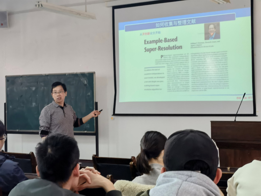 随后,张凯兵老师介绍了写论文的方法及注意事项。题目是整篇论文的精华,最好采用方法加对象的方法进行命名。摘要是论文中最重要的部分,它是整篇论文的高度总结,必须严谨。摘要首先需指出该篇论文的研究意义,然后指出已有方法的不足,其次简单介绍该论文提出的方法,最后说明该论文相比于其他先进方法的实验结果。引言是撰写论文过程中最难的一部分,它是对整个研究课题的高度总结,需要详细说明该课题的研究意义及现有方法的优缺点,需要学生阅读大量的文献并有高度的总结概括能力。要注意的是论文中出现的一些参数选择(如损失函数中的权衡参数等),最好做充足的实验用图片提高说服力。
