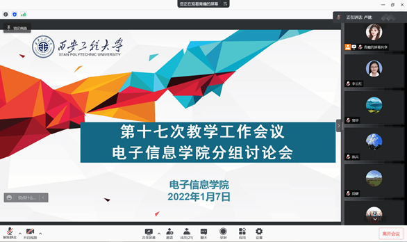 2021年1月7日下午,电子信息学院第十七次教育教学工作会第三次分组讨论会在线上召开。副校长戴鸿、电信学院党政领导、各系部正副主任、专业负责人、实验室负责人、教学秘书、教务员及教师代表参加了此次讨论会。讨论会由电信学院院长景军锋主持。