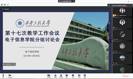 2021年12月28日下午,电子信息学院第十七次教育教学工作会第二次分组讨论会在线上召开。副校长戴鸿、校科技处处长朱耀麟、电信学院党政领导、各系部正副主任、专业负责人、实验室负责人、教学秘书、教务员及教师代表参加了此次讨论会。讨论会由电信学院院长景军锋主持。