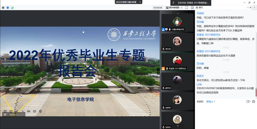 为服务毕业生的切实需求,助力毕业生升学就业,2022年6月14日晚上七点,电子信息学院邀请往届优秀毕业生代表通过腾讯会议平台进行了专题报告会。学院教师和2019级研究生共五十余人参加了本次报告,会议由研究生秘书行露老师主持。