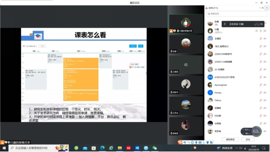 最后研究生辅导员周梦宇老师、研究生工作秘书行露老师分别就近期研究生请销假制度及日常管理规范、网络授课、师生互选、个人培养方案制定的情况做了详细的说明。在交流互动环节,与会的各位老师对研究生提出的防控区新生报到、专业细化、研究方向变更等问题做了详细的解答。