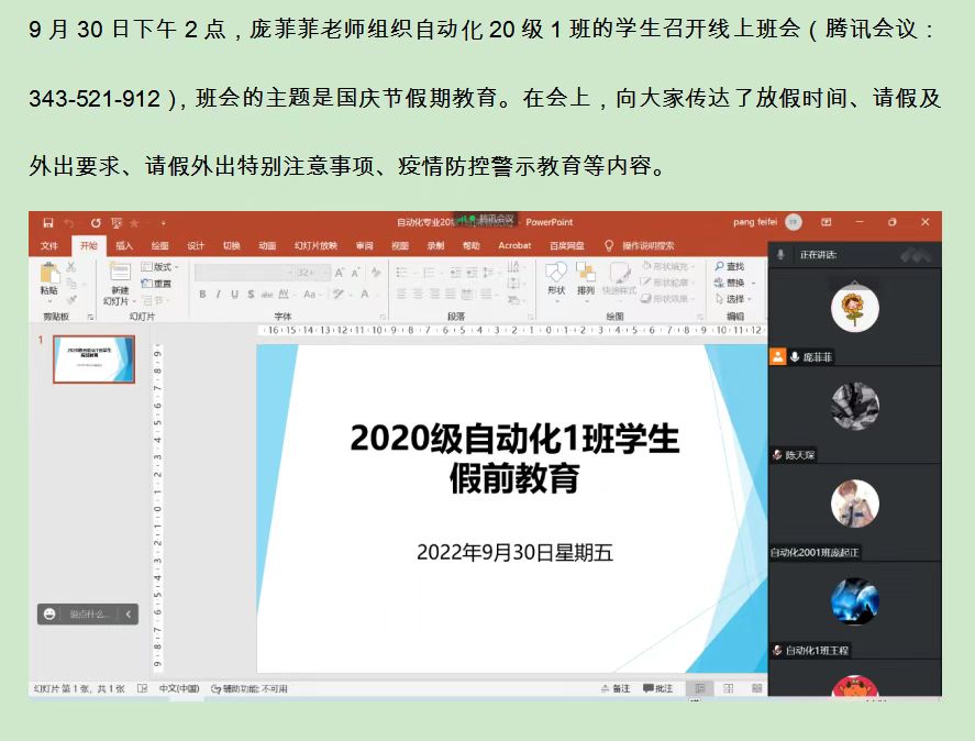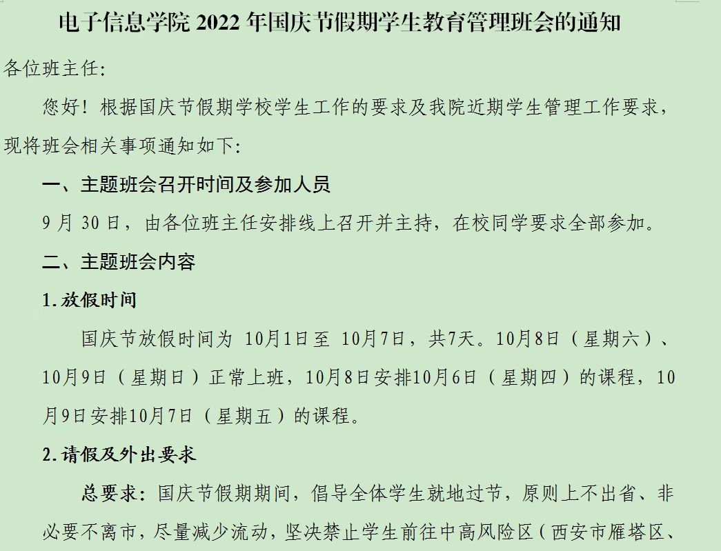 每位班主任都严格按照学院下发的《电子信息学院2022年国庆节假期学生教育管理班会的通知》要求,通过线上会议的形式,紧密围绕国庆节假期学生教育管理的问题,主要从“三全育人导师团介绍、教育管理规定解读、疫情防控警示案例学习、学生关心关注问题回应”等方面与学生们进行了充分的沟通交流,纷纷为同学们提出了四点要求:一是提高政治站位,不讲条件不打折扣的严格遵守校、院关于国庆节假期学生教育管理各项规定;二是强化纪律意识,以疫情防控违纪违法典型案例为反面教材,时刻提醒自己不触碰任何“底线”;三是主动与导师团导师建立联系,积极寻求学业、就业等方面的指导;四是坚持勤勉求学,合理规划假期,度过一个充实、安全、愉快的节日。