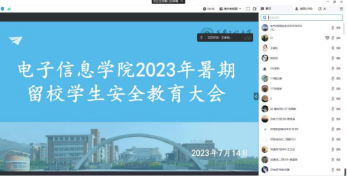 为进一步加强2023年暑期留校学生的管理,做好暑期留校学生安全保障和服务工作,强化留校纪律要求和安全管理教育,7月14日上午11时,电子信息学院通过腾讯会议召开暑期留校学生安全教育大会。学院党委副书记周晓惠、辅导员王家钰、曹智宇、黄木委以及全体暑期留校学生参加了会议,会议由王家钰老师主持。