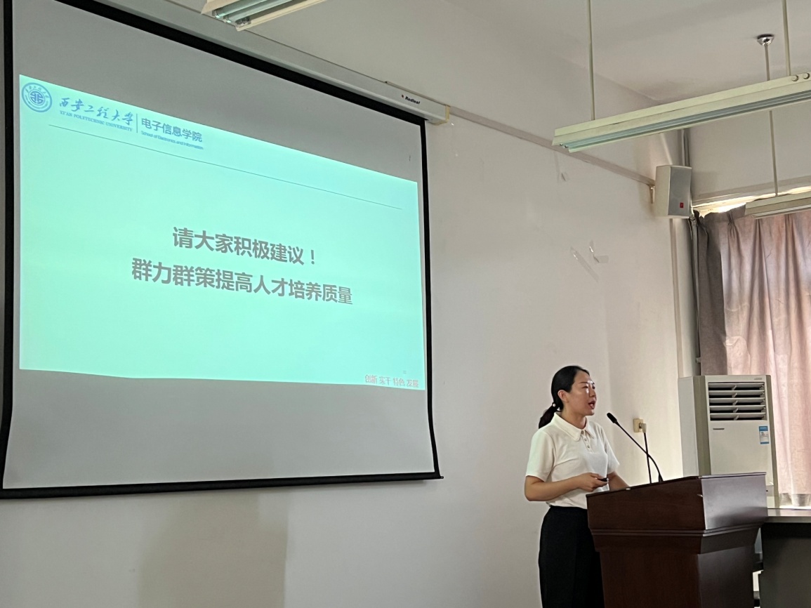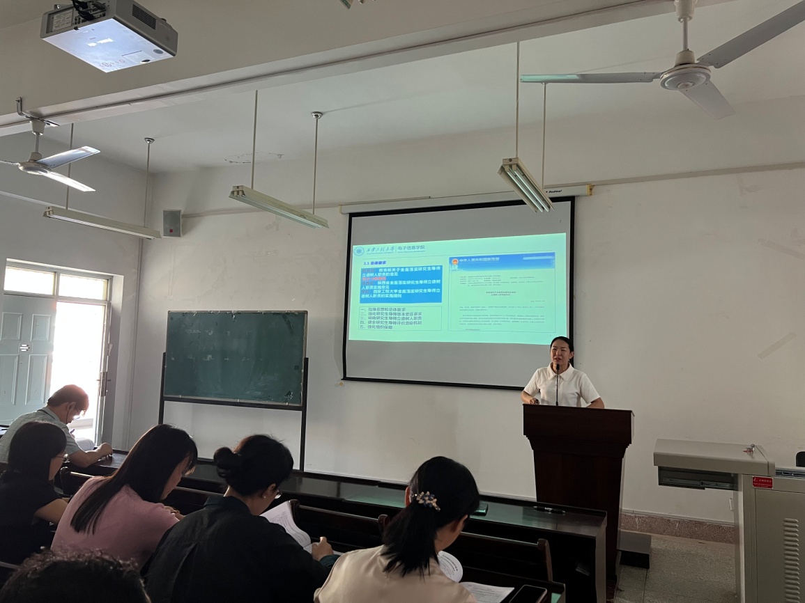 为进一步加强电子信息学院研究生导师队伍建设,全面落实研究生导师立德树人职责,提升研究生导师教书育人能力,促进导师间的相互交流、学习和沟通,2023年9月13日下午2:00,在临潼校区电信楼419学术报告厅,电子信息学院举办2023年硕士生导师工作会暨导师培训会。电子信息学院研究生主管工作副院长张蕾、副院长朱磊、学院研究生秘书及全体导师参会。会议由张蕾副院长主持。