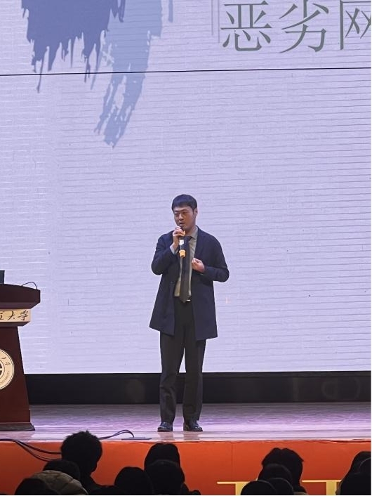 孙迪围绕近年来的恶劣网络行为、大学生网络行为失范现象的原因分析、规范大学生网络行为的教育引导策略等三个方面展开,以案例分享的形式深刻剖析了大学生群体的网络行为中存在的问题,结合“清朗·网络戾气整治”专项行动阐述了发表不当言论、“翻墙”阅读外网的危害。“网络无边,文明有界”,此次讲座旨在引导同学们知网、懂网、用网。同时要求同学们在网络中要做到理性平和,注意辨别;要慎言慎语,遵纪守法;做到文明上网、文明用网,营造清朗网络空间,汇聚向上向善力量。