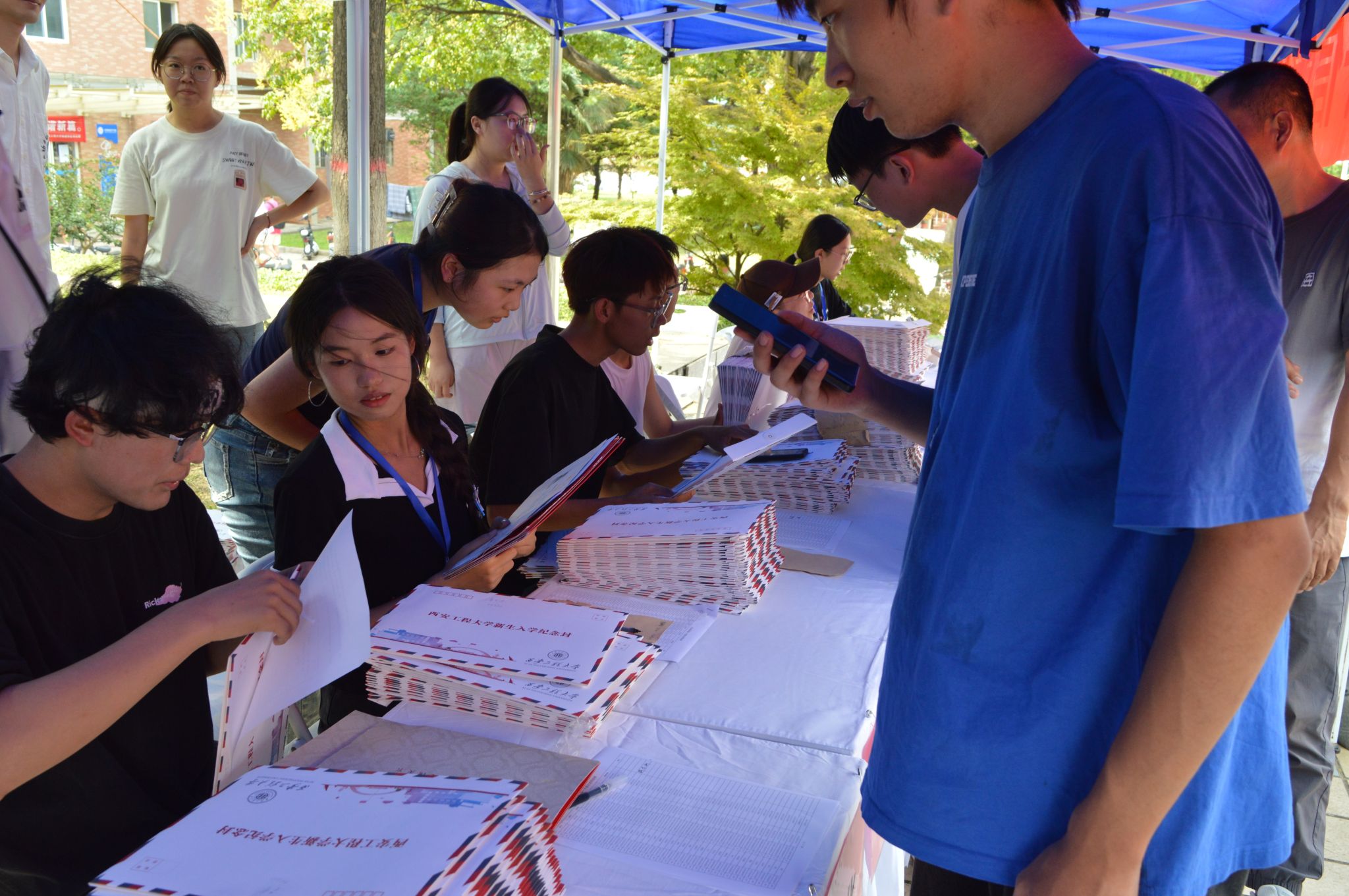 志愿者同学们积极做好服务,分工明确,彼此配合,高效率为新生同学们办理报到手续,解疑答惑,确保迎新工作有条不紊。