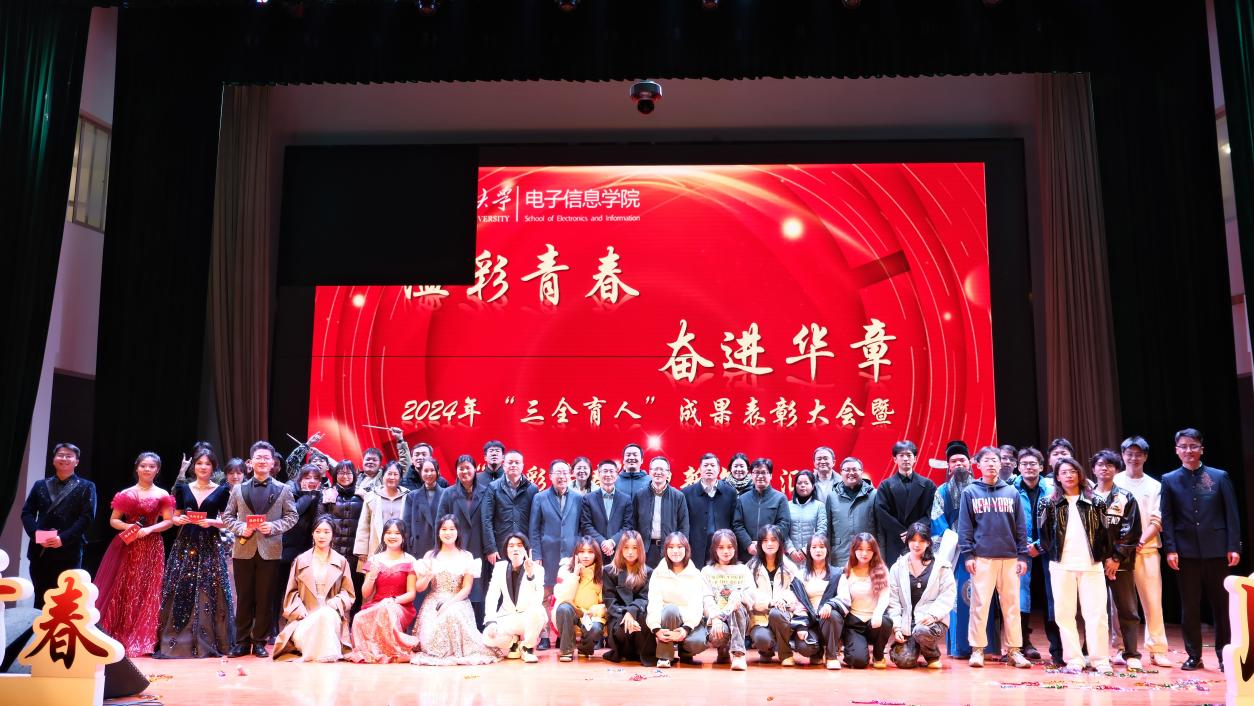12月4日晚,电子信息学院2024年“三全育人”成果表彰大会暨“溢彩青春”迎新文艺汇演在临潼校区大学生活动中心举行。校党委学生工作部部长王志,校党委研究生工作部专职副部长赖斌,校招生就业工作处副处长付刚,校团委副书记凌旭,电子信息学院党委书记杨友谊,院长景军锋,副院长朱磊,党委副书记周晓惠,院长助理李珣,学院三全育人导师团团长以及各系部主任、副主任,学院全体辅导员以及学院2024级本科生参加了本次活动。本次活动将“三全育人”成果表彰和“溢彩青春”迎新文艺汇演两环节交叉进行,实现了活动的交织性和吸引性。