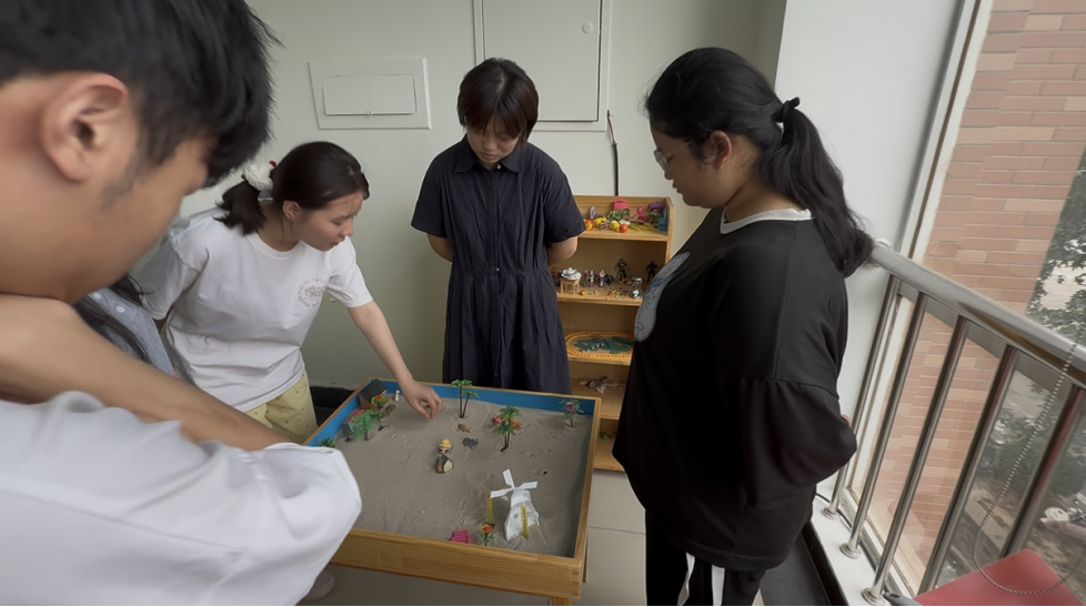 活动伊始,在马海蓉老师的引导下同学们从丰富多样的沙具中挑选出最能引发情感共鸣的一件,并结合自身经历与内心感受,条理清晰地阐述喜爱缘由。随后进入沙盘创作环节,参与者依序选取沙具进行摆放,同时根据整体构思,在遵循规则的前提下灵活调整他人已置沙具。通过团队成员间的紧密协作与创意交融,大家将各自对理想世界的憧憬具象化,共同构建出充满想象力与象征意义的立体图景,并赋予其“心之所向”的诗意命名。