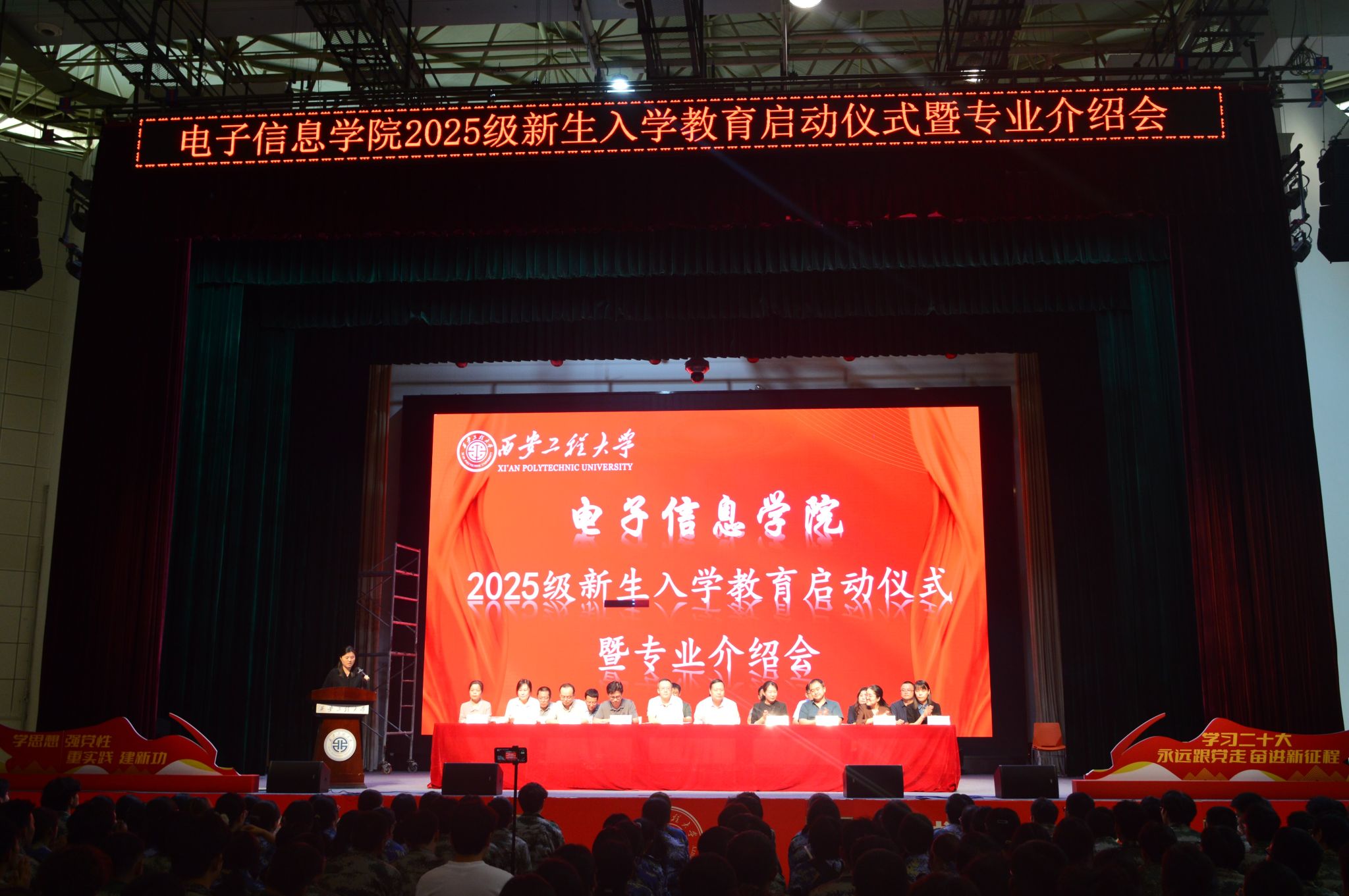 9月9日下午,电子信息学院在大学生活动中心举行2025级新生入学教育启动仪式暨专业介绍会。学院党委书记杨友谊、院长景军锋、副院长张蕾、副院长朱磊、院长助理朱永灿及各系(部)中心主任、各专业负责人、全体辅导员和全体2025级本科生和研究生共同参加本次大会。本次大会由学院党委副书记周晓惠主持。