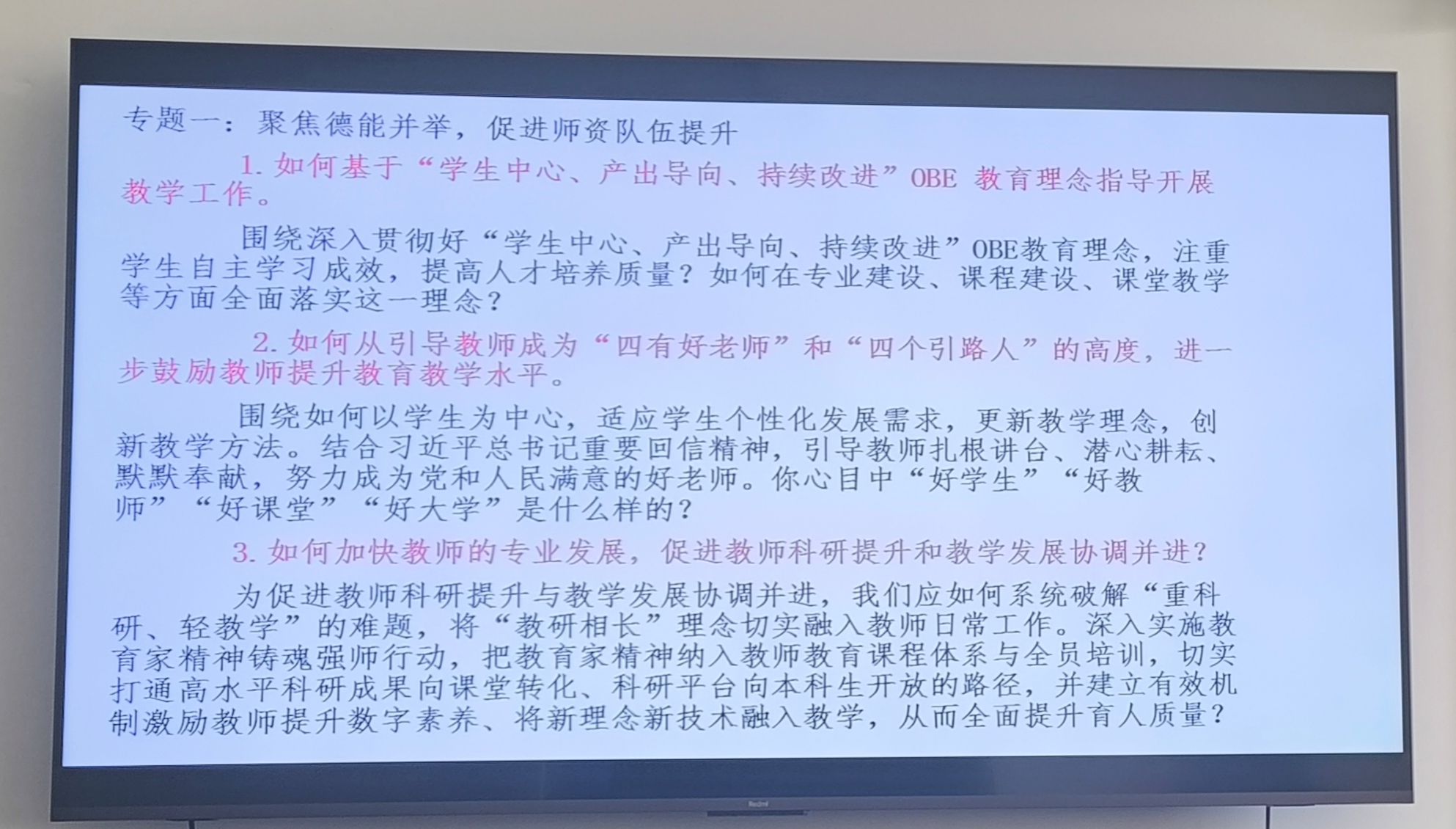 本次会议主要就“师资队伍提升”和“打造特色质量文化”两个专题展开讨论。信息与通信工程系主任张晓丹老师首先强调在贯彻以学生为中心的OBE教育理念时,应科学合理地贯彻该教育理念,避免完全按照学生“私人意愿”行事,应向有利于学生发展的方向改进完善教育教学方法,教师在授课过程中既要完成知识和技能的传递,又要让学生自然而然地感受到关怀,实质上给授课老师提出了更高的要求。