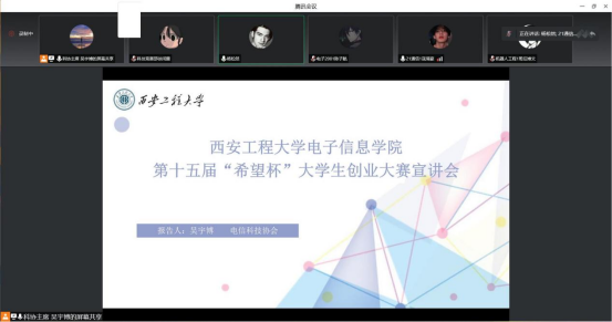 推进大众创业、万众创新,是发展的动力之源,也是富民之道、公平之计、强国之策。大学生是大众创业、万众创新的生力军,“挑战杯”正是行军路上的试炼赛道。为更好地动员更多同学参与“挑战杯”系列赛事,帮助新生同学更好地了解竞赛内容及流程,电子信息学院于9月14日晚七点在线上举办“挑战杯”系列赛事宣讲会。学院党委副书记周晓惠、团总支书记杨松然参加,科技协会主席、往届参赛选手吴宇博主讲,二百余人次参与宣讲。