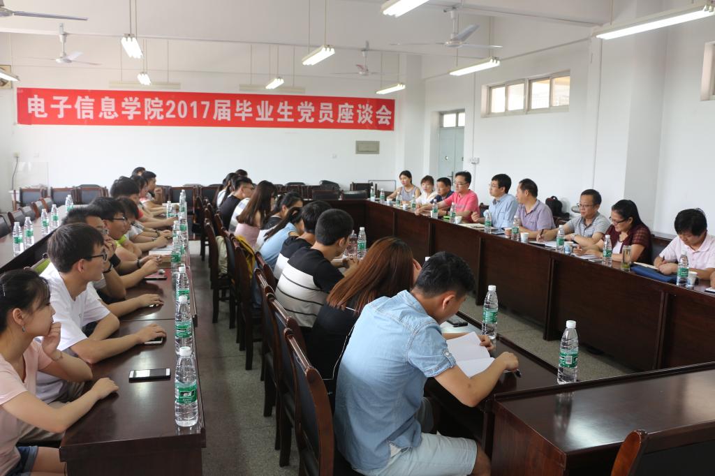 为引导毕业生党员文明离校,充分发挥党员先锋模范作用,2017年6月15日下午,电子信息学院在电信楼419举办了主题为“青春·理想·责任”的毕业生党员座谈会。学院党委书记孙晓宁、副院长王延年、副院长李云红、党委副书记杨建军、各系部主任、全体辅导员及毕业生党员代表50余人参加了座谈。座谈会由杨建军主持。